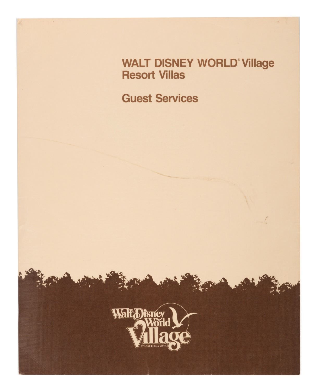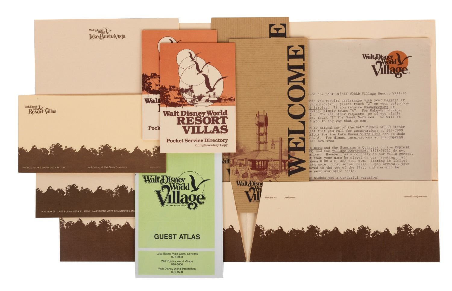 (Walt Disney World Village, 1983) A folder of materials prepared for the services of guests of the Walt Disney World Village Resort Villas. Among the materials are a letter of introduction, (7) sheets of paper and two envelopes featuring the Resort letterhead, two Directories, two Pocket Service Directories, and two Guest Atlases. Measuring between 5.5"x3.75" and 11"x8.5", the vintage ephemera is in used but very good condition within a 12"x9.5" good condition folder.