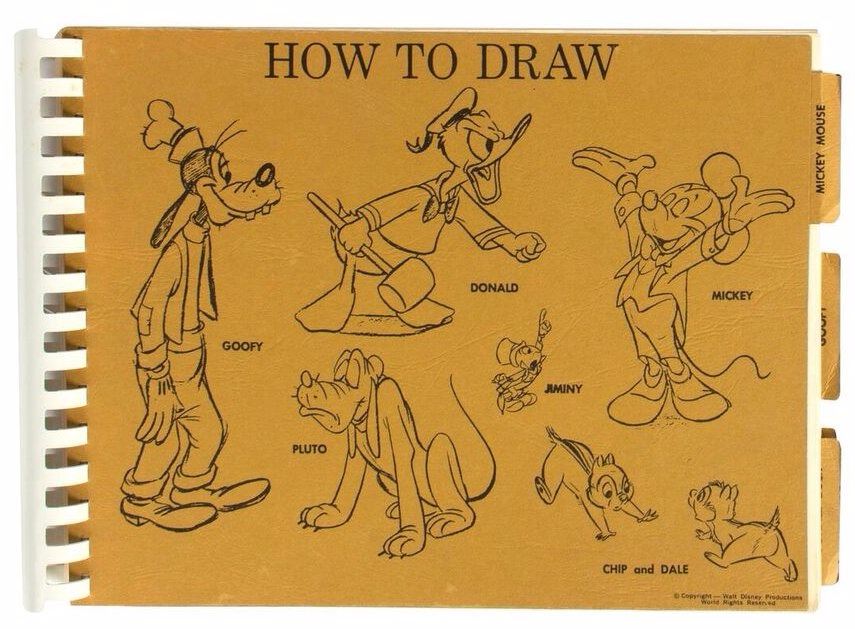 (Walt Disney World, c.1971) A rare "How to Draw" book created in the Walt Disney World print shop for WED employees. The book, from the estate of Disney Legend Ralph Kent, contains animator's model sheets and descriptions on how to draw popular Disney characters and was used as character reference by WED's artists and designers. This 67-page spiral-bound book measures approximately 8.5"x12" and is in good condition with minor cover-wear from use and a few small scribbles on a couple pages. The back of the cover reads "WDW Print Shop".