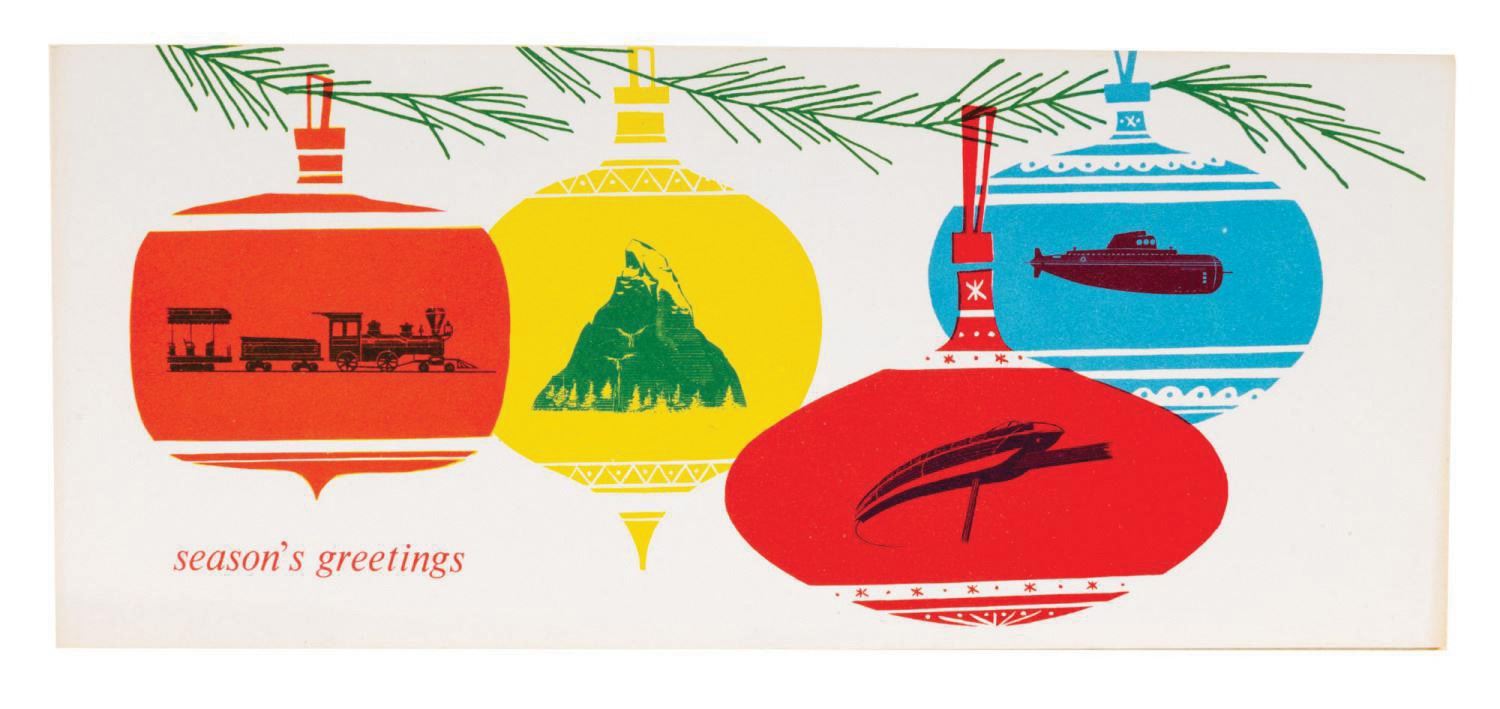(Disney, 1959) A Christmas card created for use by the staff of Wed Enterprises. The festive card features graphics of the C.K. Holiday, and circa 1959 Disneyland attractions such as the Matterhorn, Submarine Voyage, and a three-car Monorail train. The card comes complete with original cream-colored envelope bearing the embossed WED Imagineering logo and Flower Street address in Glendale. Measuring just under 4"x9.25", the bifold card and accompanying envelope are in fine condition, with minor wear to edges the edges.