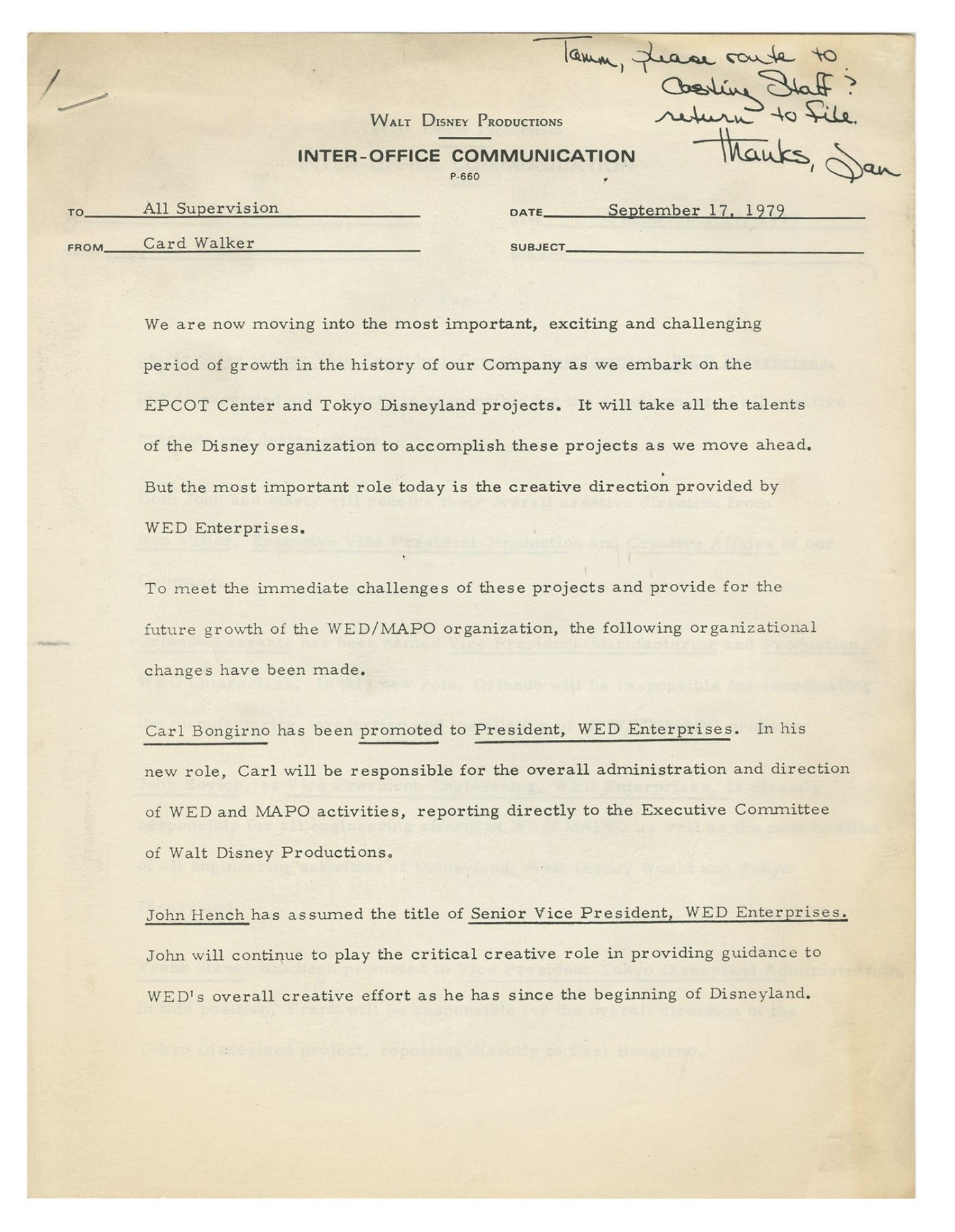 (Epcot, 1979) An inter-office communication from Card Walker which details organizational staffing changes for WED/MAPO. The memo explains that these changes are caused by the ongoing Epcot Center and Tokyo Disneyland projects. The 3-page communication measures 11"x8.5" and is in good condition with expected wear from age and use, including some bending to the edges and two small tears on the bottom sheet.