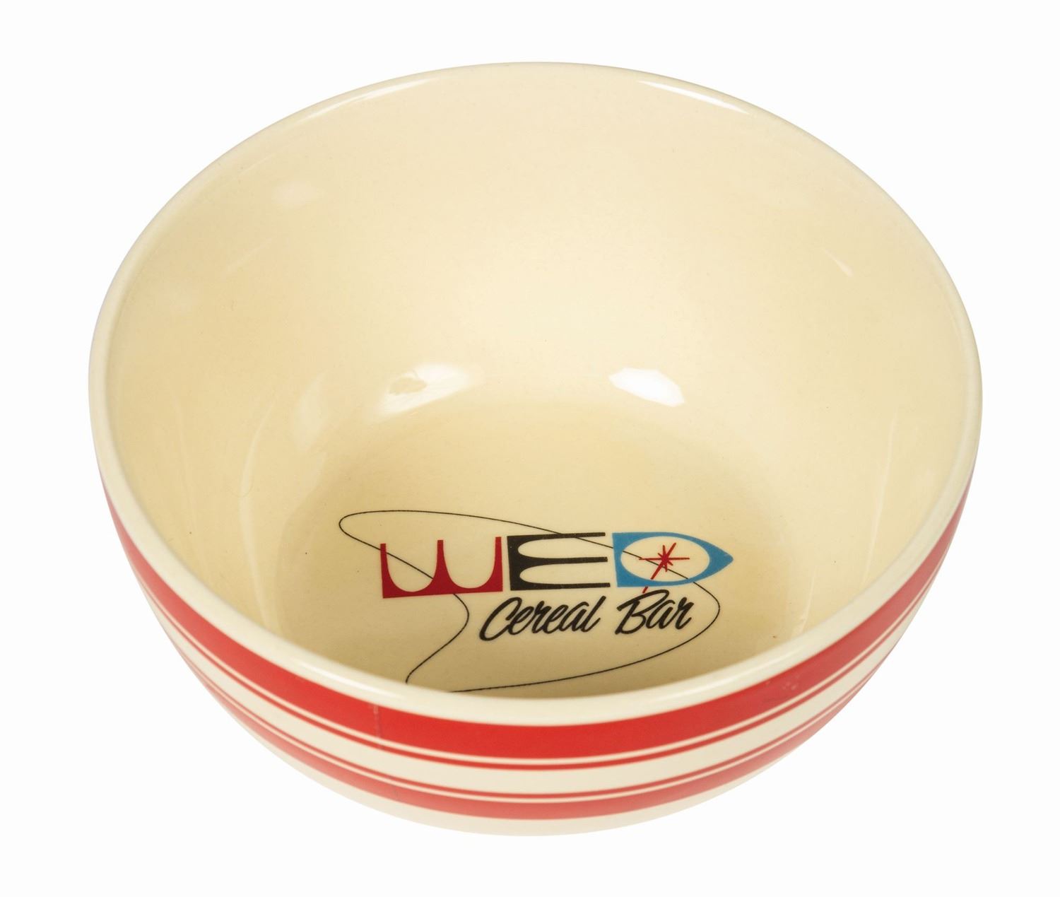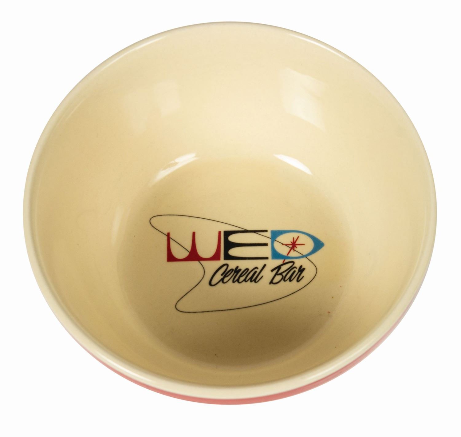 (Imagineering, c.2000) A rare cereal bowl issued to WED Imagineers in the early 2000s when a cereal bar was installed in the employee commissary, the Big D Café. This stylish retro bowl features 1950s-esque red and white stripes around the body and a Mid-Century WED Cereal Bar logo in the well. Measuring 6” in diameter and 2.75” tall, the bowl is in very good condition with slight manufacturing irregularities to stripes and minor scuffing to the bottom from commissary use.