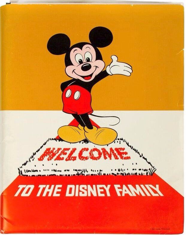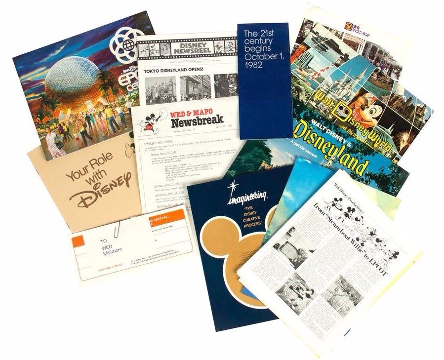 (Disney, c.1983) A very rare employee welcoming packet for new WED employees. This packet includes pictorial guides for Disneyland, Disney World, EPCOT, and the soon to open Tokyo Disneyland, as well as WED newsletters, directions to the mailroom, and several other employee publications. This set is in good condition with minor wear throughout.