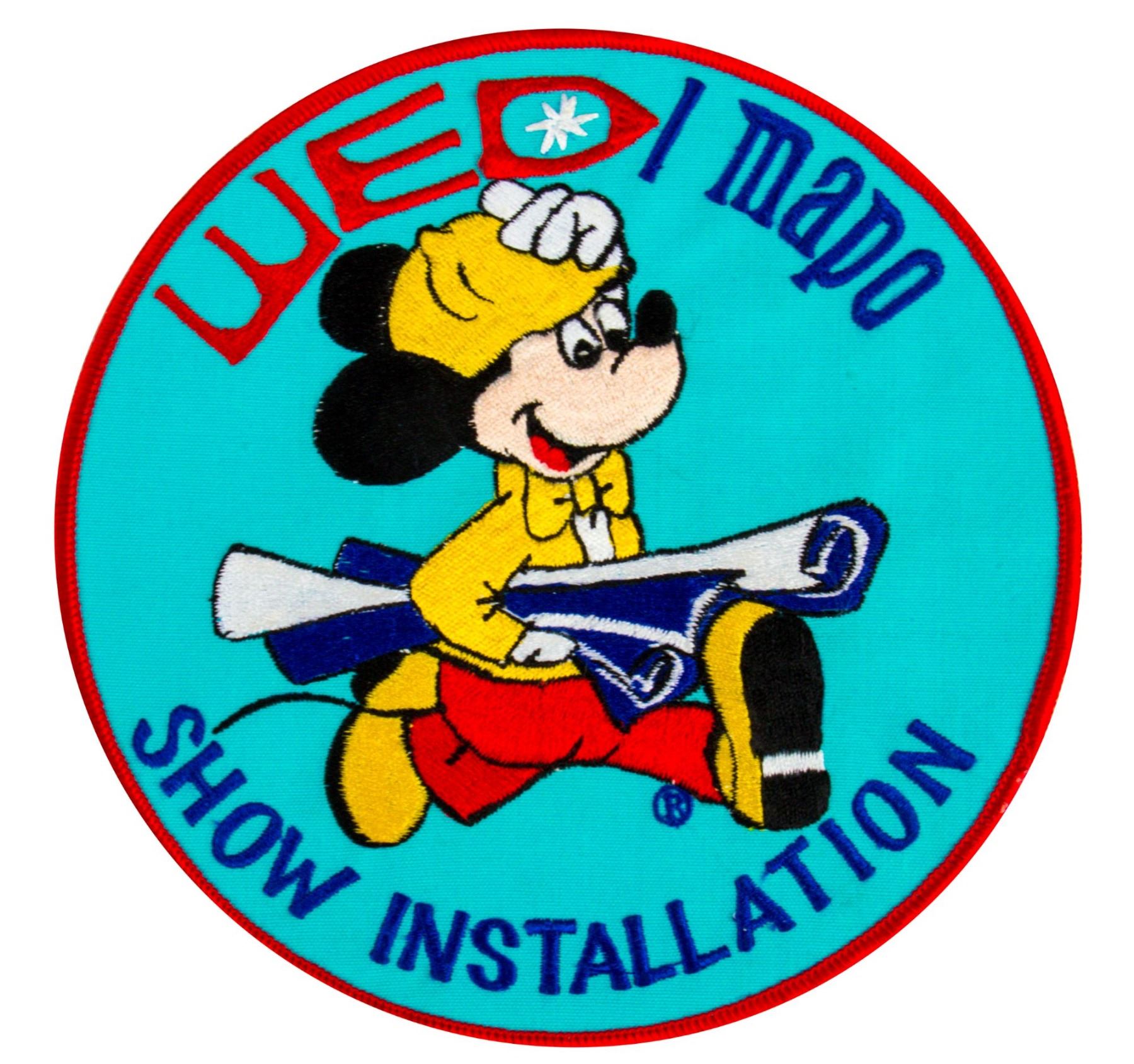 (Disney, 1980s) A large jacket patch created for WED-MAPO personnel. The design features a construction Mickey Mouse, and the patch was designed for the back of a jacket. The patch measures 7" in diameter and is in very good unused condition.