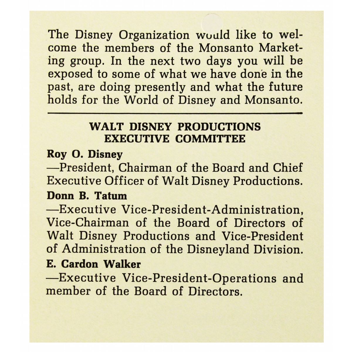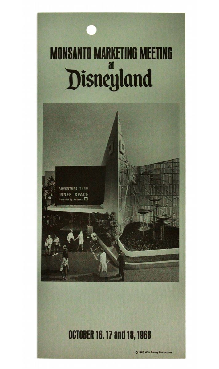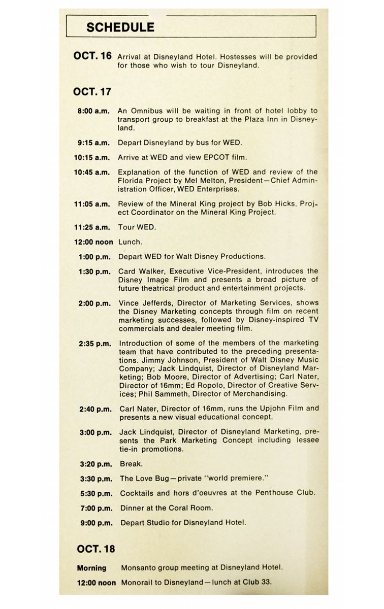 (WED, 1968) A fascinating information booklet for Monsanto executives who were treated to a whirlwind, three-day event at Disneyland, the Disney Studio and the offices of WED Imagineering in October 1968. Hosted personally by Roy O. Disney, Donn Tatum and Card Walker, this event was to expose Monsanto (a major sponsor of the Disney theme parks) to the plans for the various Disneyland, Mineral King and Disney World/EPCOT projects. The itinerary is jam packed with visits to the park, the Disneyland Hotel, the studio, the WED Imagineering offices, film premiers, Club 33 and more. Measuring 8.5 x 3.5 in. and in very good condition.