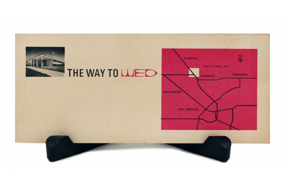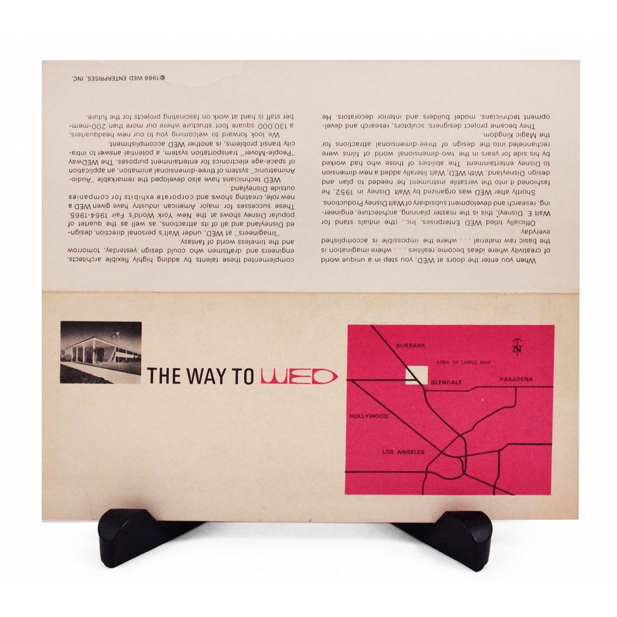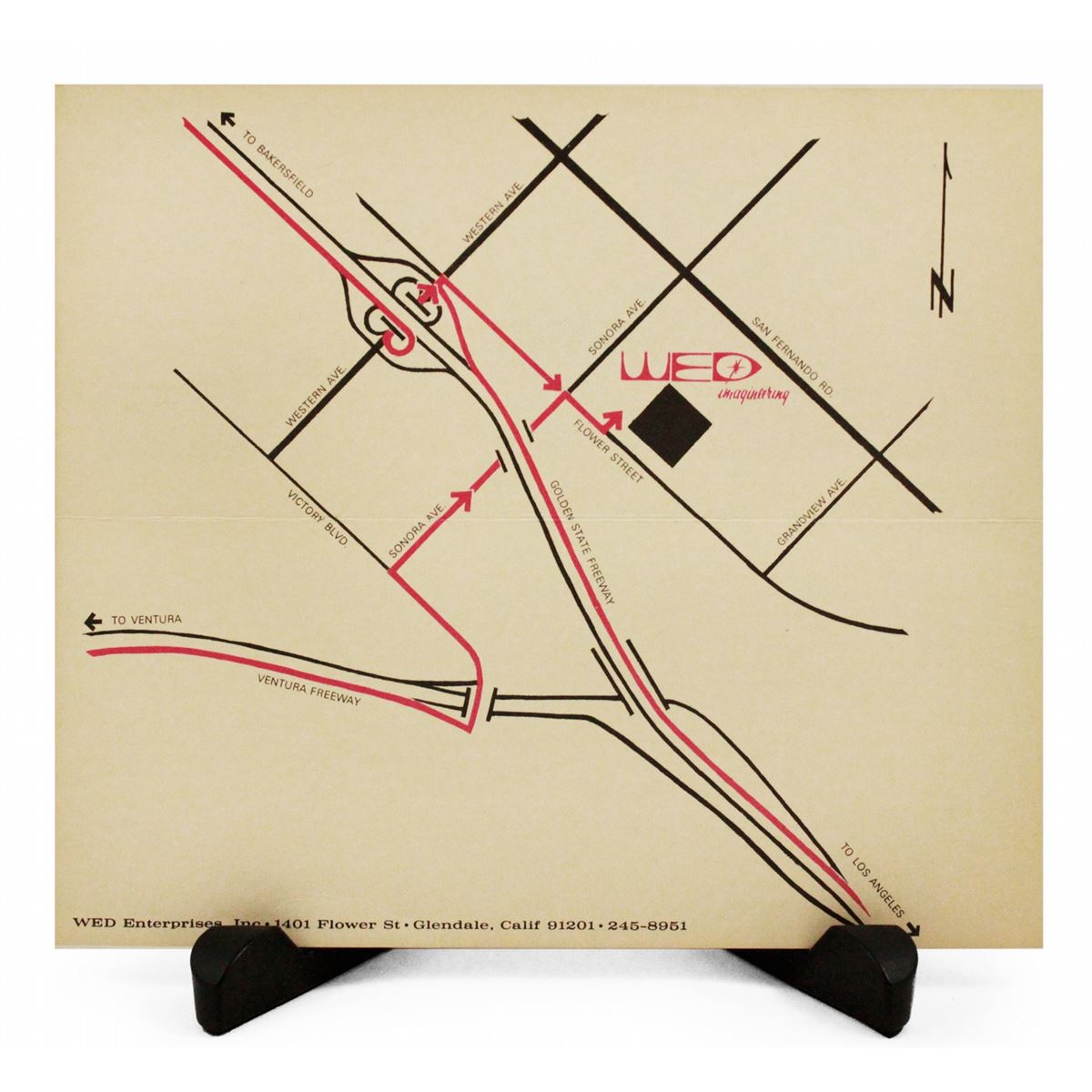 (WED, 1966) In 1966, Walt acquired more property on Flower Street in Glendale, California to house the soon-to-be-expanded WED offices for the planning of the New Tomorrowland in Disneyland and the Florida Projects” of EPCOT and Walt Disney World. This move combined the scattered departments of WED from up the street on Sonora Avenue and several offices on the studio Main Lot. This unique map card announces the move and gives background on the division and its new location. This is the only example we have seen ever offered. Measuring 8.25 x 7.25 in. and I very good condition.