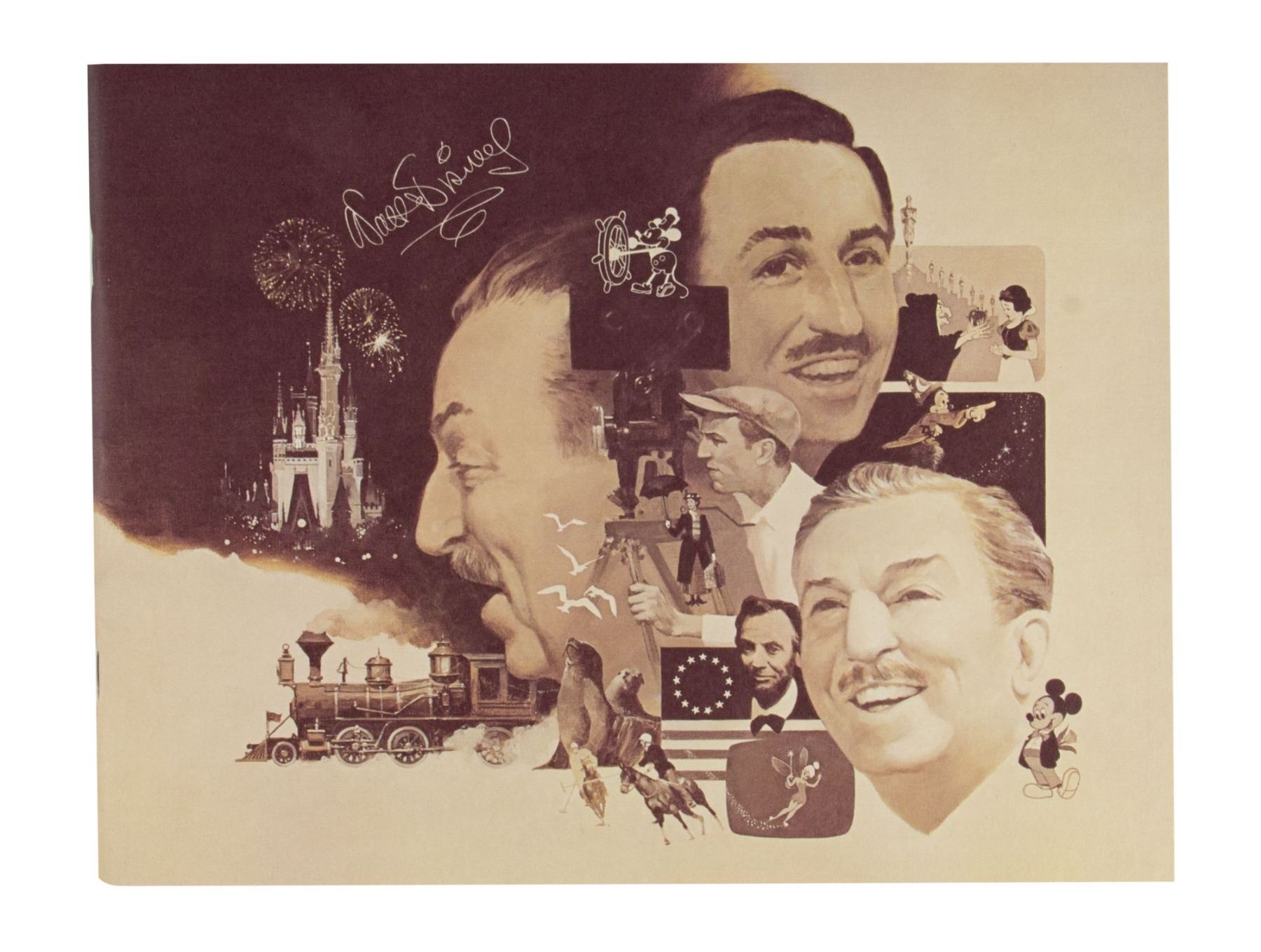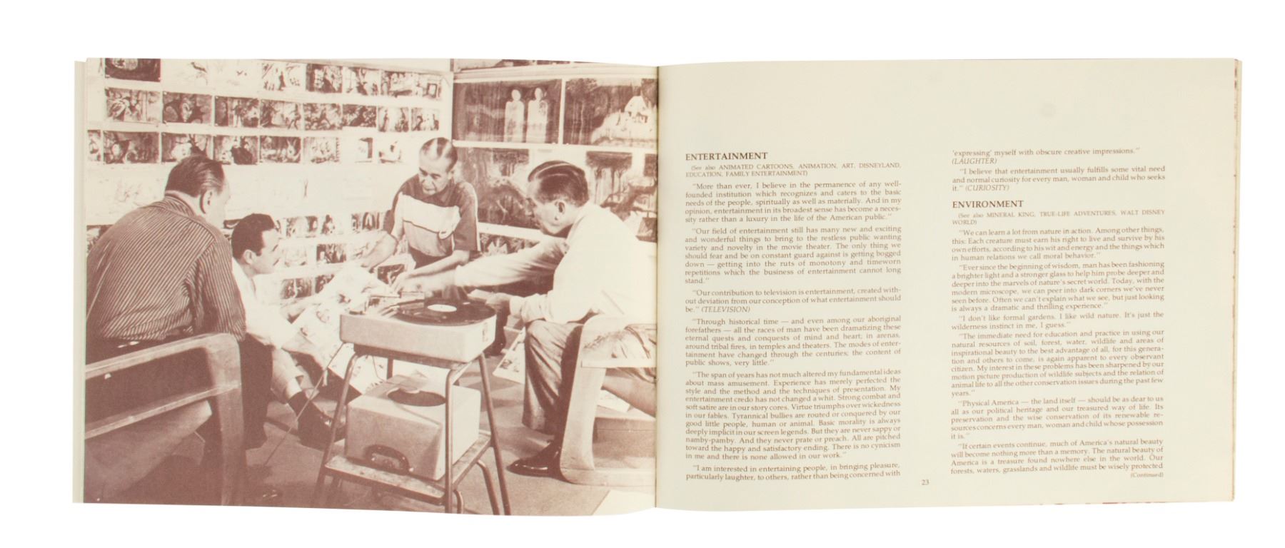 (Disneyland, 1987) A rare book of quotes by Walt Disney paired with photos from his career. This book was created by the Walt Disney Archives, the Studio Publicity Department, and the Disneyland and Walt Disney World Disney Universities. The quotes are sorted by categories such as "family", "leadership", and "Disneyland", and provide incredible insights into Walt's philosophies and thoughts. The 48-page book measures 8.5"x11" and is in very good condition with minor wear.