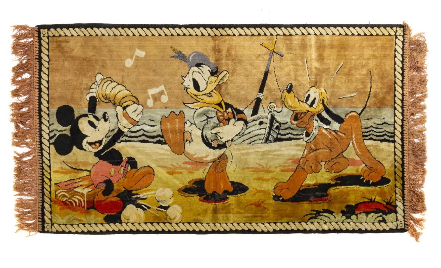 (Walt Disney Studios, c.1930s-40s) A vintage tapestry featuring Mickey, Donald, and Pluto in a musical beach scene. The colorful tapestry measures approximately 21"x40" and is in fair to good condition with some color fading and areas of discoloration from age.