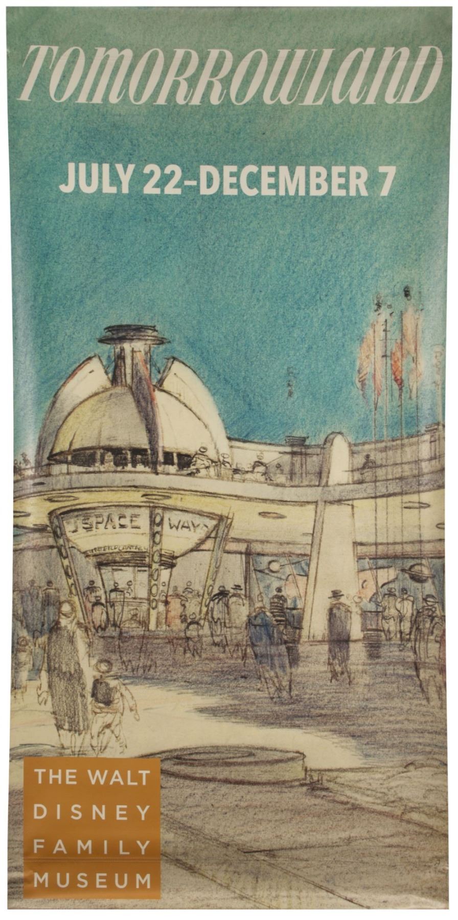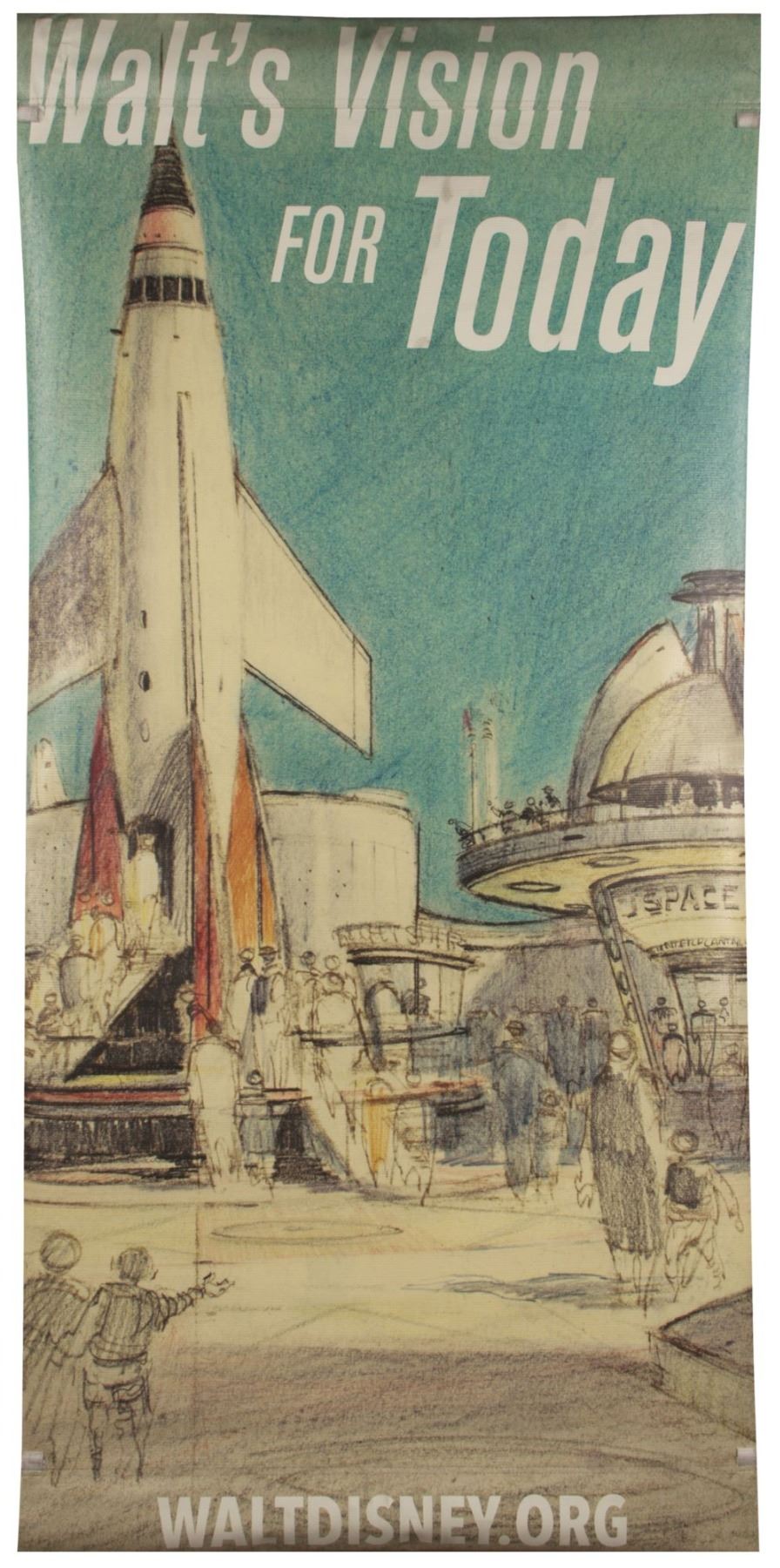 (Disneyland, 2015) A large printed banner used to promote Tomorrowland: Walt's Vision For Today, an exhibit at The Walt Disney Family Museum. Featuring stunning Tomorrowland concept art by Imagineer Herb Ryman, this double-sided banner shows two vibrant scenes from the same concept art. Measuring 72"x36", the banner is in very good overall condition with minor surface wear from use.