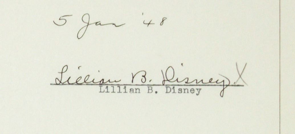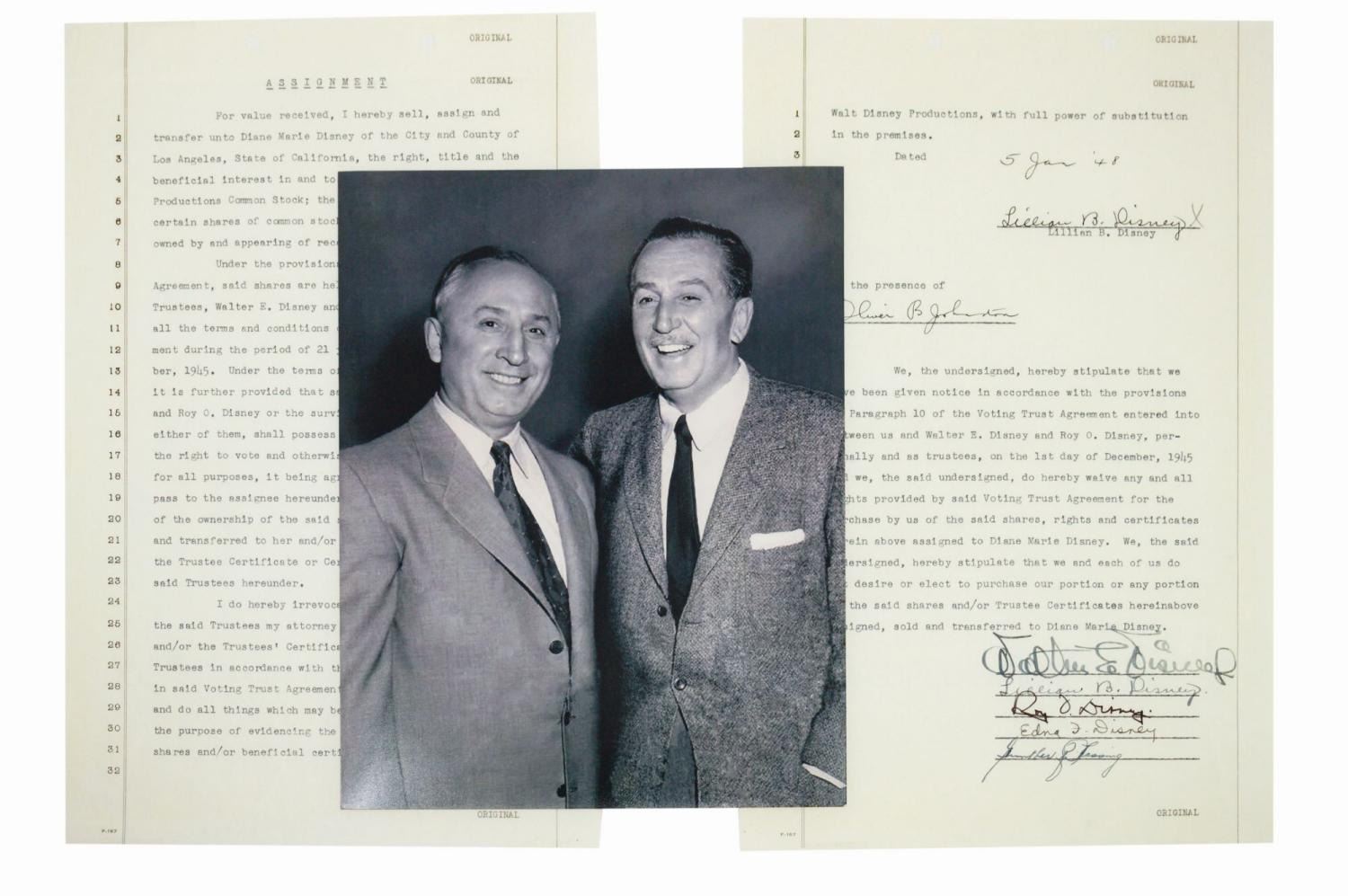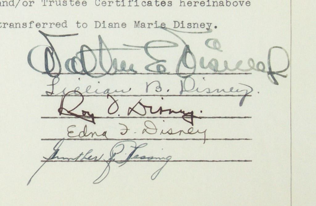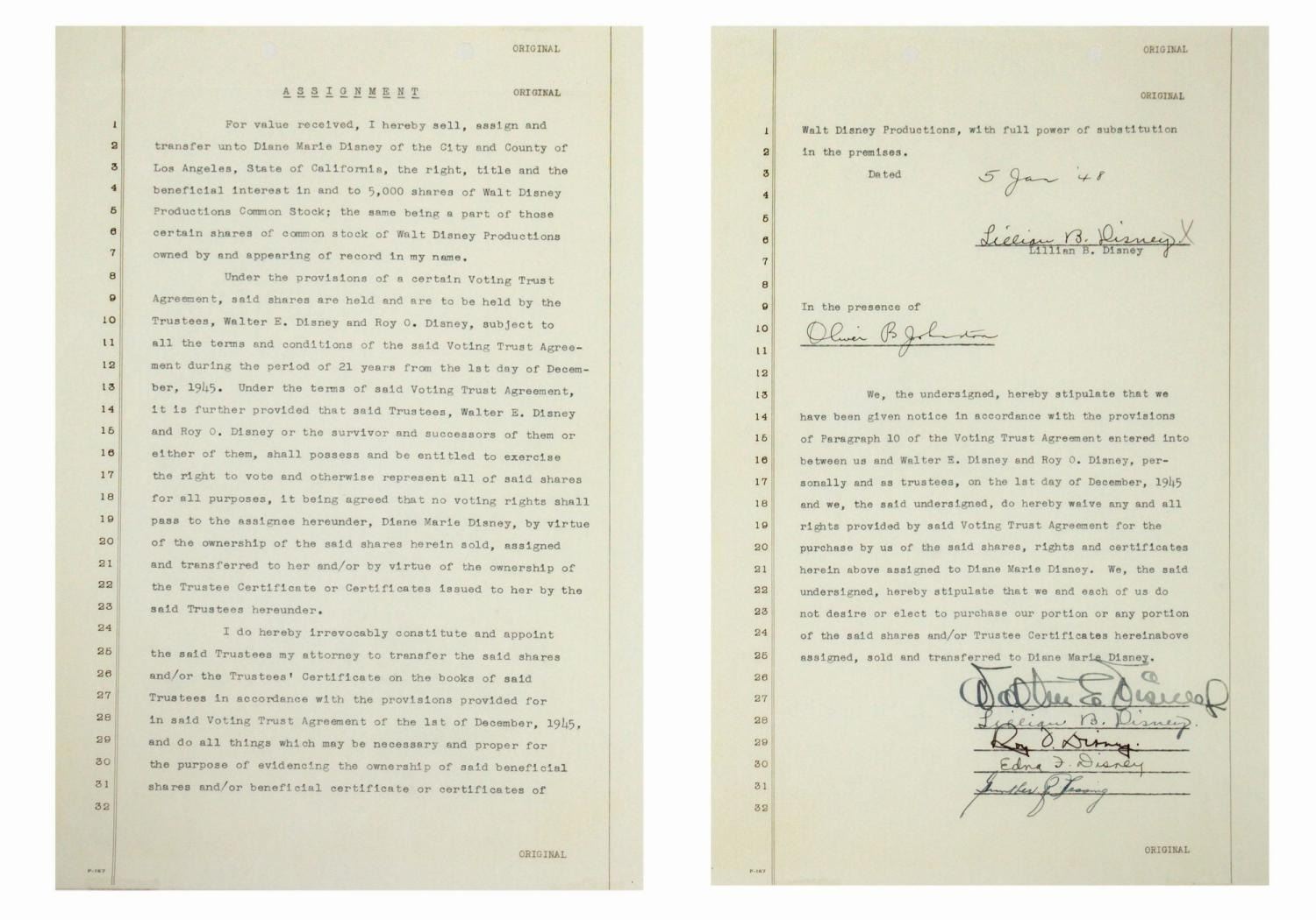 (Disney, 1948) An original typed 2-page stock assignment on two-hole punch onionskin legal paper signed by Walt Disney, Roy O. Disney, Lillian Disney, Edna Disney, and Walt Disney Productions legal counsel and Vice President, Gunther Lessing. The typed document details a stock sale and assignment to Diane Marie Disney (Walt's daughter, Diane Disney Miller) of 5,000 shares of Walt Disney Productions Common Stock from Lillian Disney. Lillian signs in black ink on the designated line towards the top of page 2. Per a Voting Trust Agreement from three years prior, Walt Disney, Roy Disney, Edna Disney, Gunther Lessing, and Lillian (again) sign the document, waving their rights to purchase a portion of the 5,000 shares being sold/assigned. It is extremely rare to have one document containing the signatures of so many significant members of the Disney Family. The signatures are executed in black ink on lines at the bottom of page 2. A fascinating look behind the scenes of Walt Disney Productions, the document features the autograph of not only Walt, but his family members and close business associates. Measuring 13"x8.5", the piece is in very good condition with staple holes at upper right and minor tape residue and handling wear. COAs from noted Disney autograph expert Phil Sears and JSA are included.