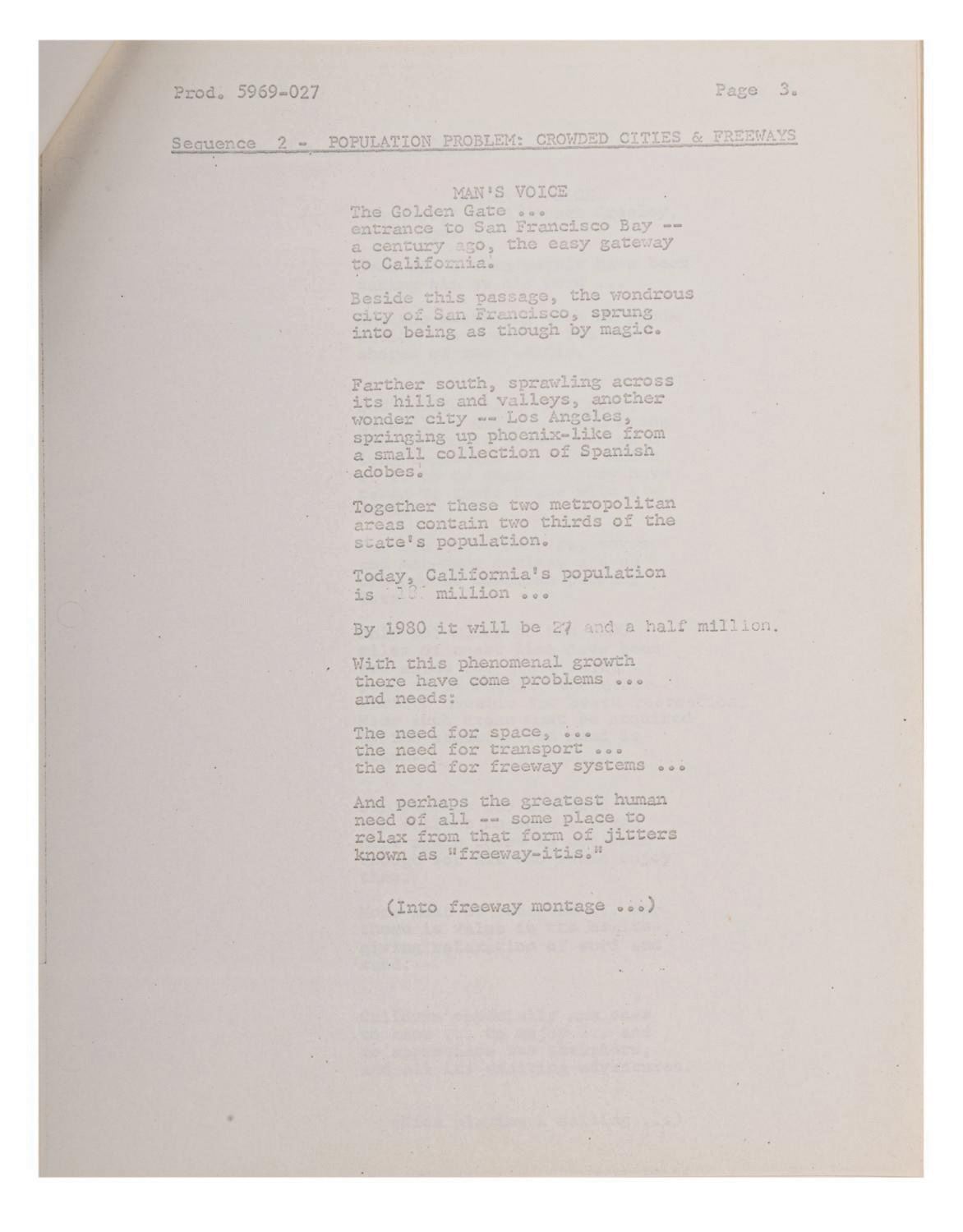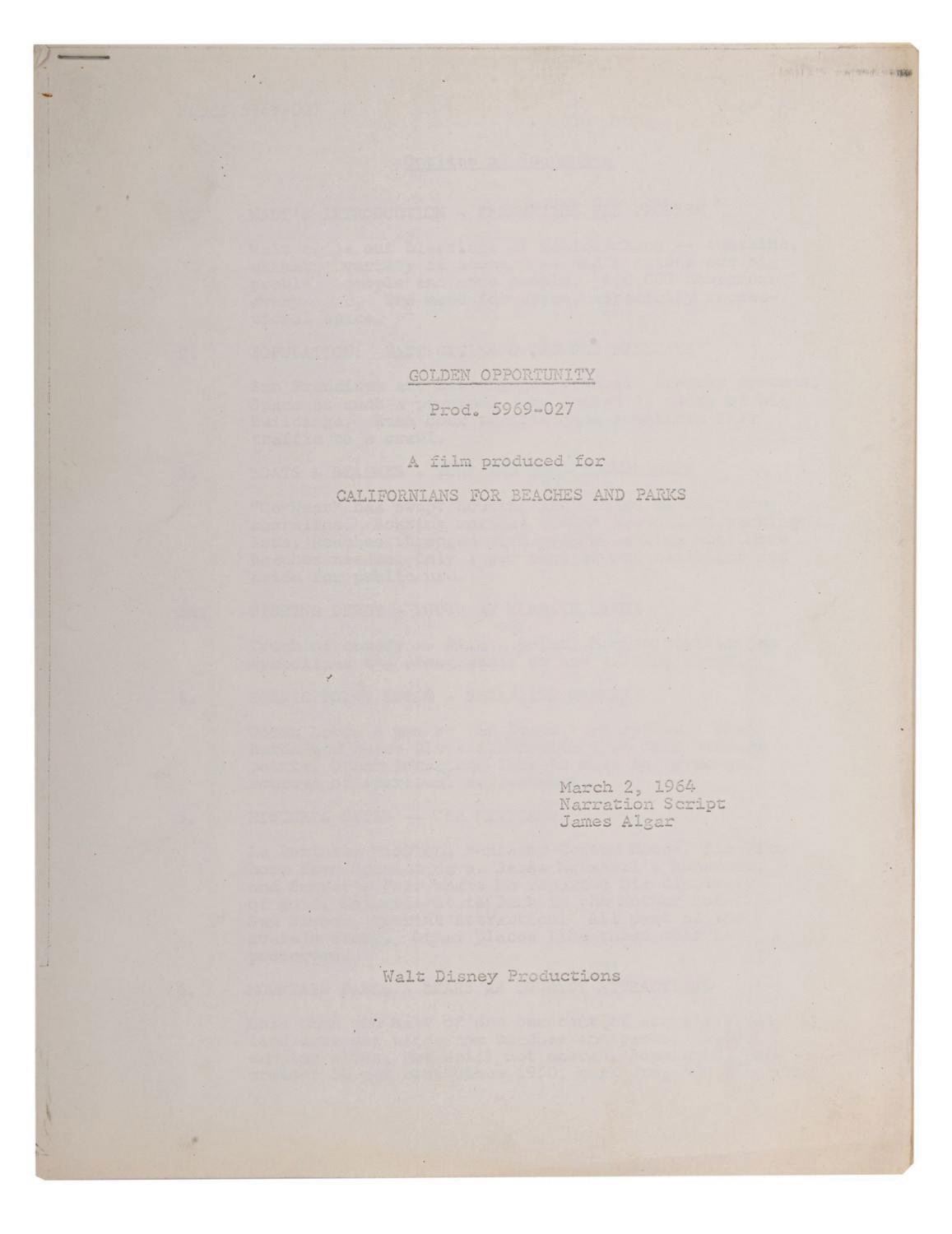 (Disney, 1964) A sequence outline and narration script for "Golden Opportunity," a short film by Walt Disney and narrated by James Algar. Walt Disney produced this promotional film to advance a 1964 state proposition for more parks backed by the "Californians for Beaches and Parks" organization. Measuring 8.5"x11", the 18-page document is in very good condition, with minor discoloration, wear, creases and folds to edges and corners.