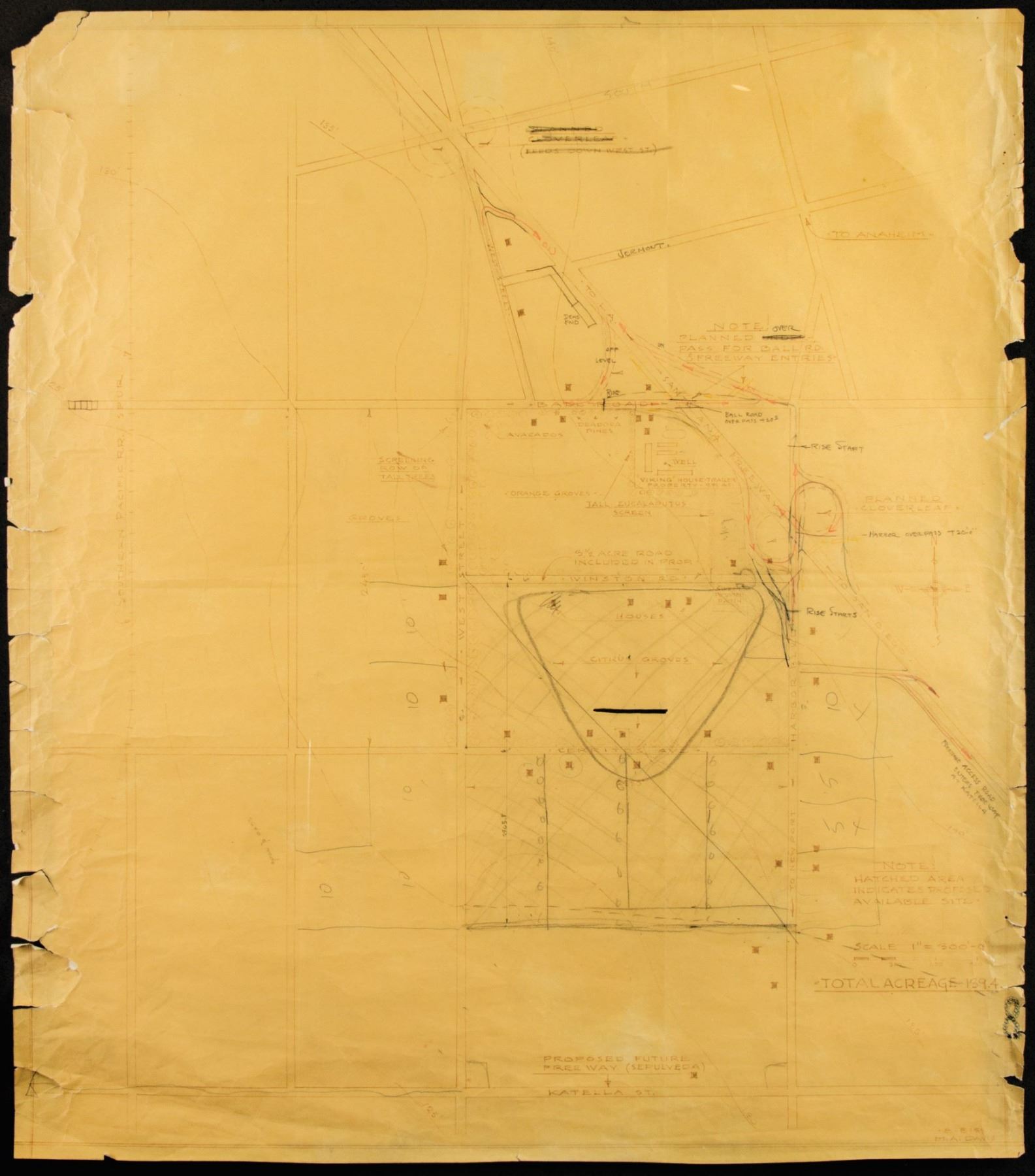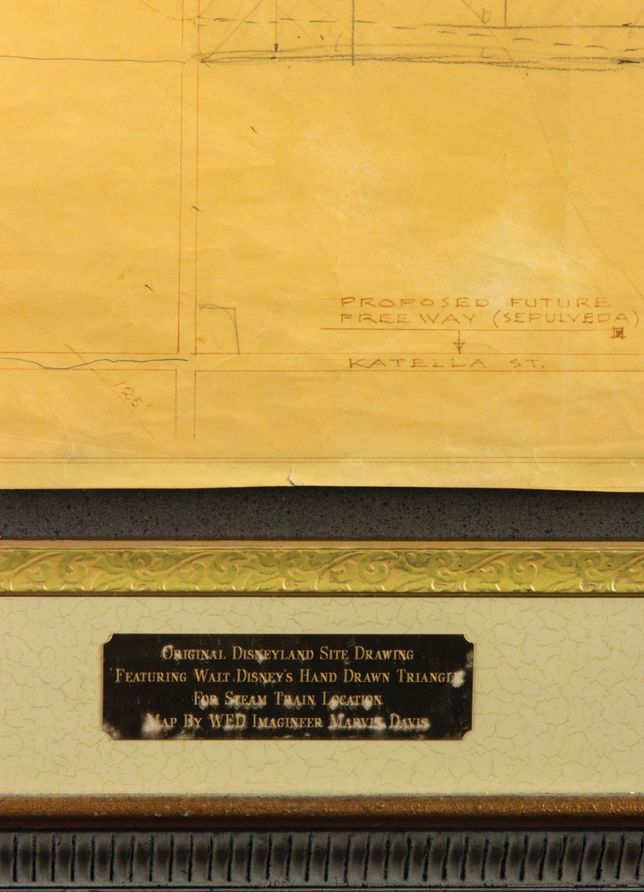 (Disneyland, 1953) In August of 1953, architect Marvin Davis created a plot plan of the orange groves purchased by Walt Disney on which to build his theme park. While reviewing the plot plan with Davis, Walt Disney took his grease pencil and drew a triangle to represent where he wanted the trains to run, thus creating the boundaries of the park and giving birth to Disneyland as we know it. Measuring 28"x25" this incredible piece of Disneyland history represents not only the earliest known appearance of the shape of Disneyland or its depiction in Anaheim, but also Walt Disney's personal involvement and input in every aspect of the park, including its boundaries. This site plan comes with a Certificate of Authenticity from the Carolwood Pacific Historical Society that is signed by Marvin Davis, the creator of the site plan who witnessed Walt Disney drawing the boundaries; and Michael Broggie, Founder & Historian at the Carolwood Pacific Historical Society. Additionally, the historical record of this site plan can be further read about in the Disneyland History book, "Walt Disney's Railroad Story" by Michael Broggie. This incredible artifact represents the true beginnings of Walt's park and is a well-established piece of Disneyland history. The plan is professionally mounted in a custom 40"x37" frame with a plaque. The site plan is in good condition with some tearing around edges of the paper and expected wear from age and use.