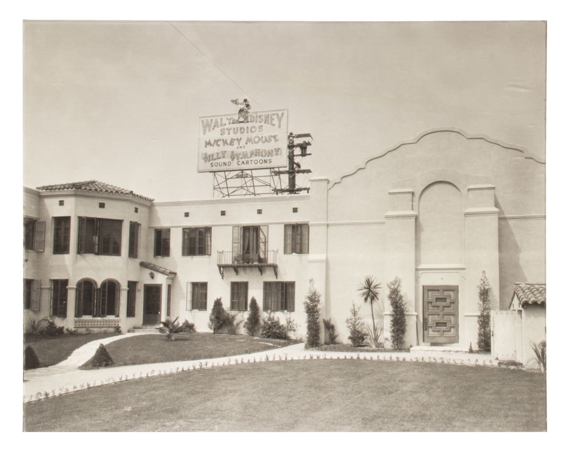 (Walt Disney Studios, 2006) A limited edition replica of the Walt Disney Studios Hyperion Avenue sign. Created in metal, plastic, and wood by artists Kevin Kidney and Jody Daily, the sign measures an impressive 19"x25". The original sign used neon, which is colorfully represented in the blue and red lettering of this replica. The lights are turned on and off by moving Mickey's arm at the top of the sign. The condition is good with some light scratching, and a small spot of separation to the bottom-left corner of the frame. Two of the four inner lighting fixtures need to be replaced. The sign comes in its original box, which features a wonderful vintage photo of the original sign in use at the studio.
