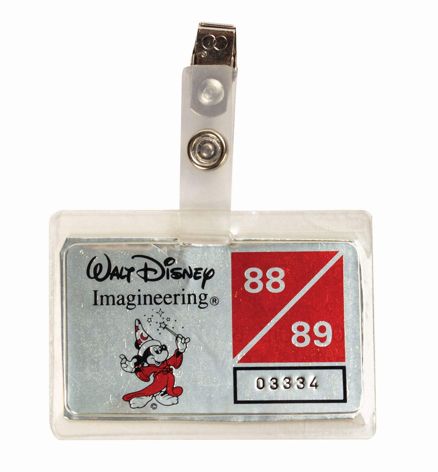 (Imagineering, 1988-89) A rare security identification badge for use at Walt Disney Imagineering, the division of the company responsible for designing theme parks and attractions. This metallic badge features the Imagineering logo of Sorcerer Mickey and is stamped "03334." Measuring 2.25"x3.25", the badge is in very good condition with only minor wear from use.