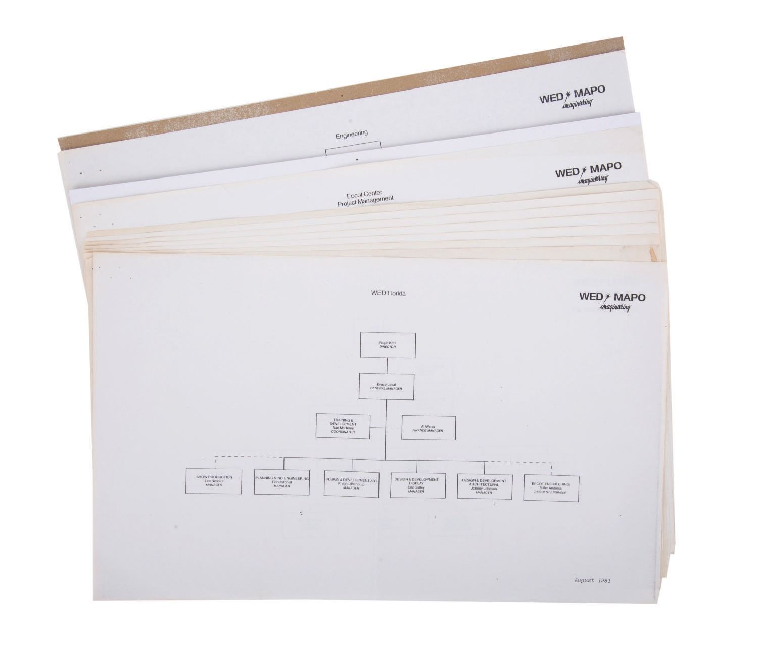 (Walt Disney Imagineering) A collection of (10) communications charts sheets detailing the managers, directors, and supervisors of WED and MAPO. Two of the sheets are mounted to artist's board. The sheets are in very good used condition, with creases, folds, and a few spots of discoloration.