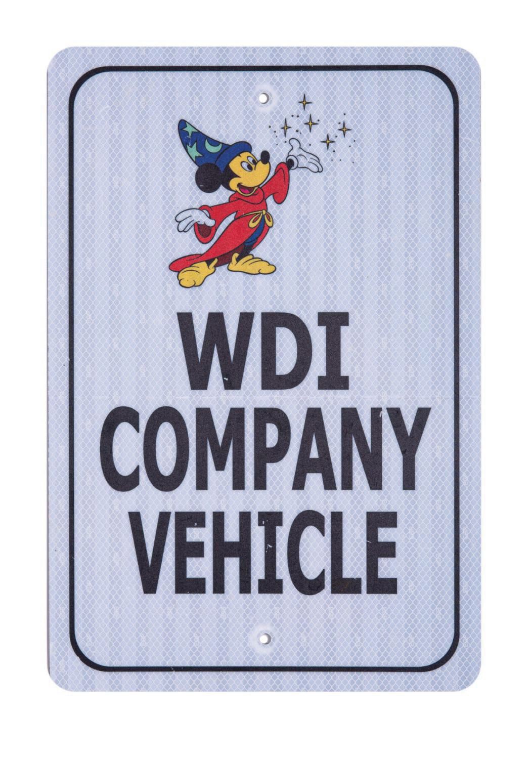 (Disneyland, c.2000) A Walt Disney Imagineering company vehicle parking sign. The metal sign features the Sorcerer Mickey Imagineering logo and a reflective background for visibility. Measuring 18"x12", the piece is in good condition overall, with some surface wear, paint chipping to the lettering, and wear around the screw holes from previous mounting.