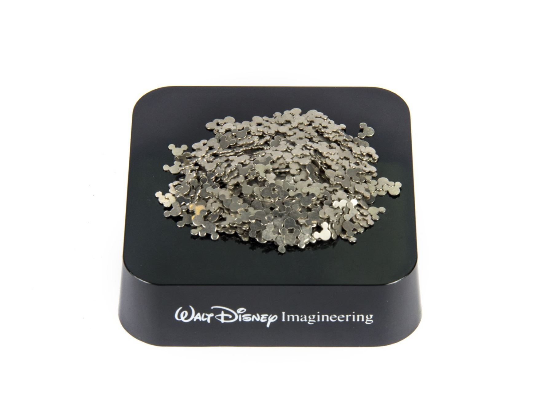 (Disneyland, c.2000) A gift given to members of Walt Disney Imagineering. This desk magnet toy features many small Mickey-ear shaped metal pieces which sit on the black magnetic base. The cluster of Mickeys can be shaped and formed in creative ways. The base measures 4"x4" and 1.25" thick and the gift is in overall very good condition.