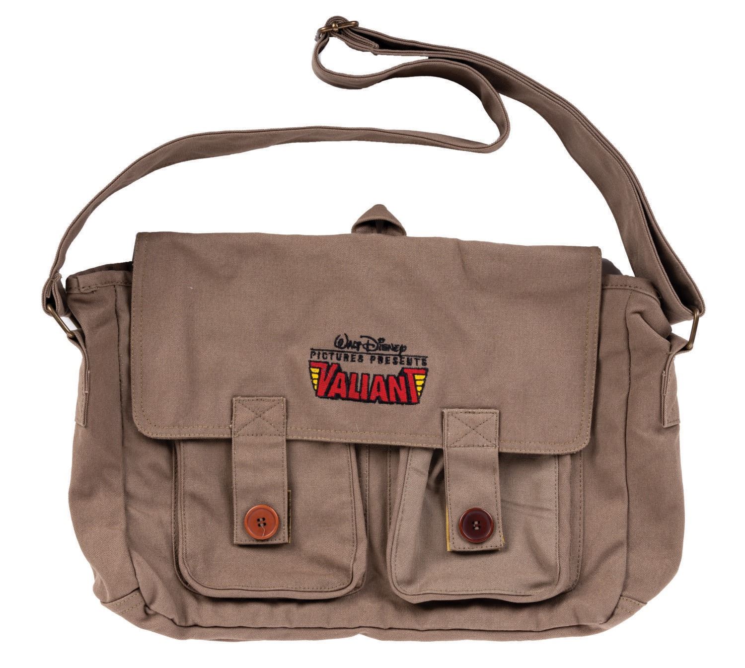 (Disney, 2005) A Walt Disney Pictures "Valiant" messenger bag. The bag was given to the cast and crew of the Walt Disney Pictures animated World War II-era film. Measuring approximately 11.5"x18", the bag has Velcro straps, two additional pockets, and is in overall fine condition.