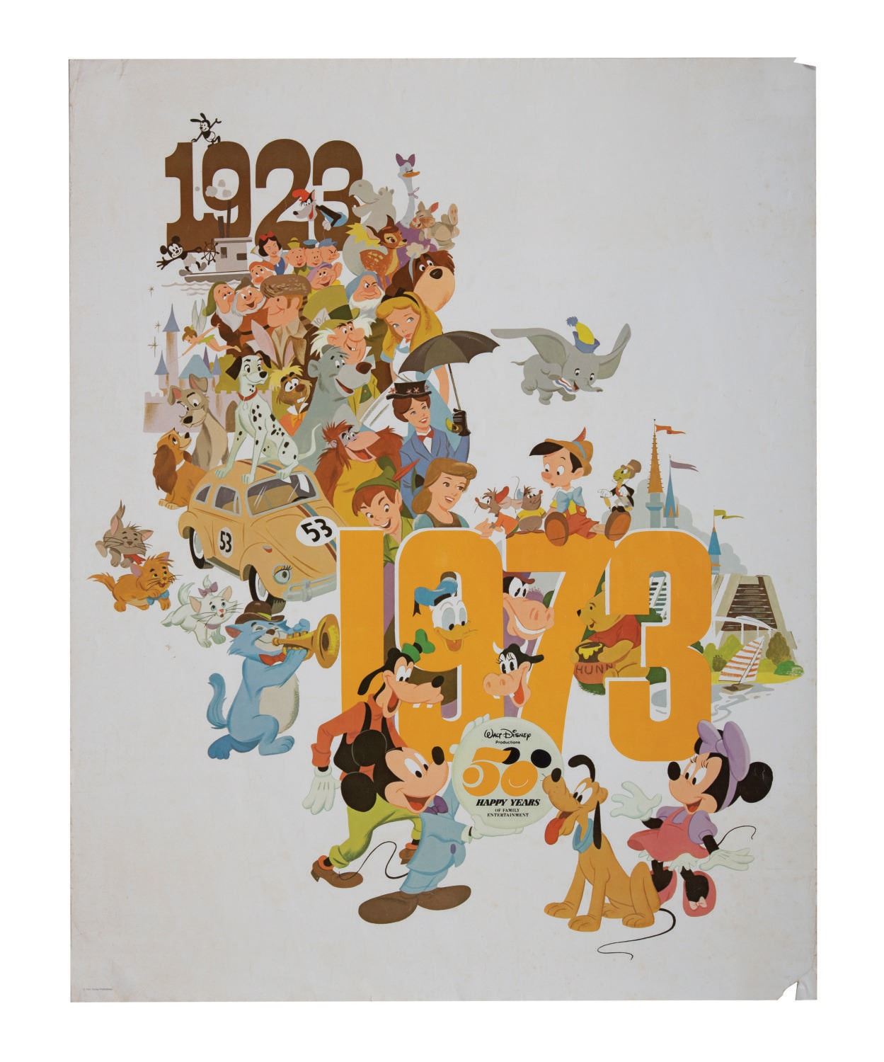 (Disney, 1973) A poster celebrating "50 happy years of family entertainment" with Walt Disney Productions. Measuring 21"x25" the poster displays in very good condition, exhibiting slight wear from previous display.