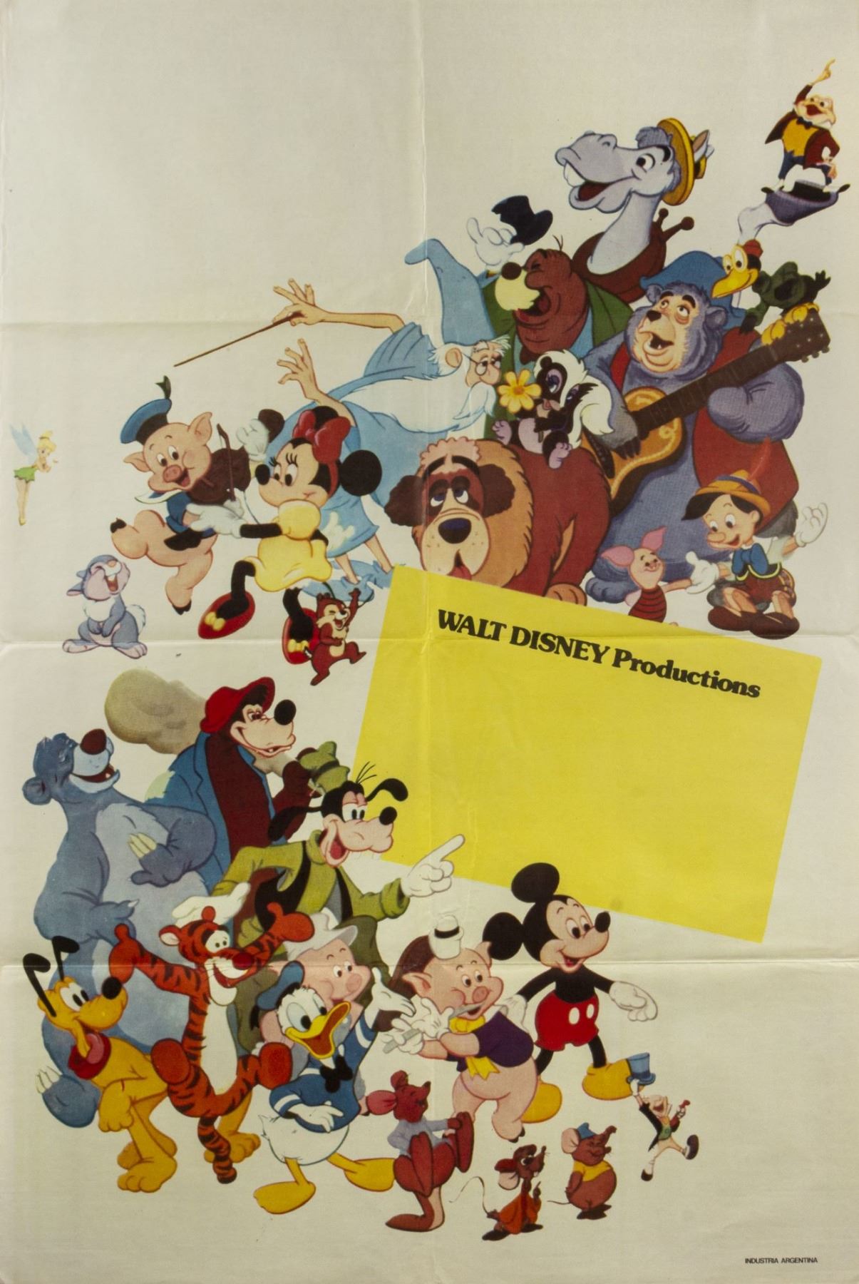 (Walt Disney Studios, c.1977) A very rare theatrical stock poster for Walt Disney Productions films that were to be shown in Argentina. Depicting a large variety of Walt Disney characters, the poster has a blank yellow square where Argentinian theaters would be able to add details about specific showings. Measuring 42.75"x29", the poster is in good condition overall with some wear along the original fold-lines and some creases throughout. There are a few ink spots that are believed to have occurred during production of the poster.