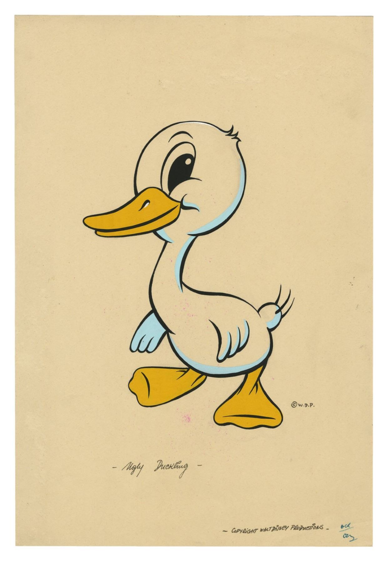 (Walt Disney Studios, c.1940s-50s) A hand-painted Walt Disney Productions art card concept of The Ugly Duckling. Believed to have been created as a concept for a fan card or another similar publicity item, the black outlines and eyes for The Ugly Duckling are printed on cardstock with the character's color hand-painted in acrylic. The bottom-right corner has an approval signature for the artwork. Measuring approximately 13.5"x9", the artwork is in good condition with worn areas around the edges from use and some scattered areas of purple paint.