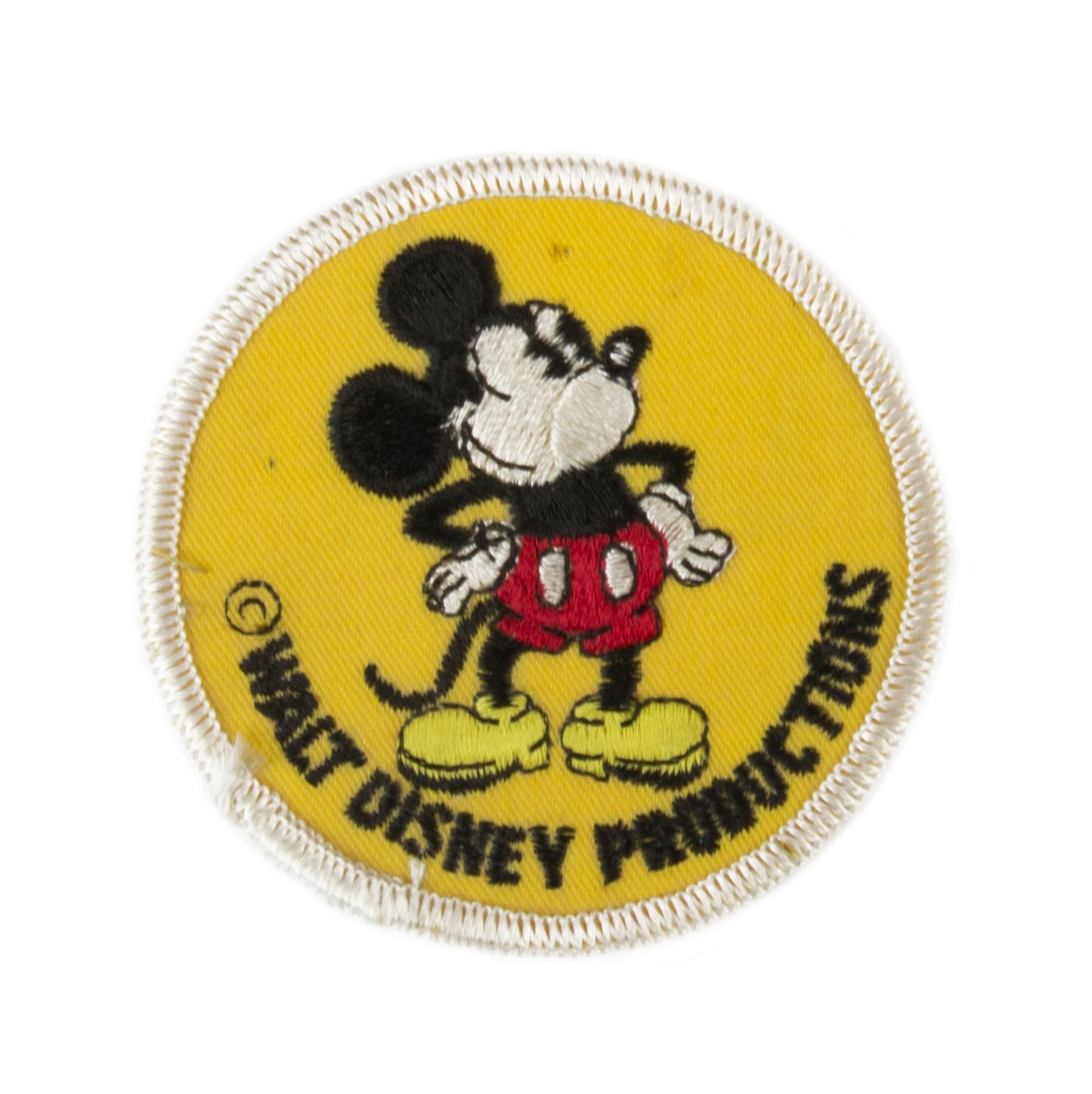 (Disney, c.1960s-70s) A Walt Disney Productions patch featuring Mickey Mouse. Mickey is depicted in a familiar pose with his hands on his hips, and the patch background features a nice yellow color. Measuring 3" in diameter, the patch is in good condition with some small spots of discoloration.