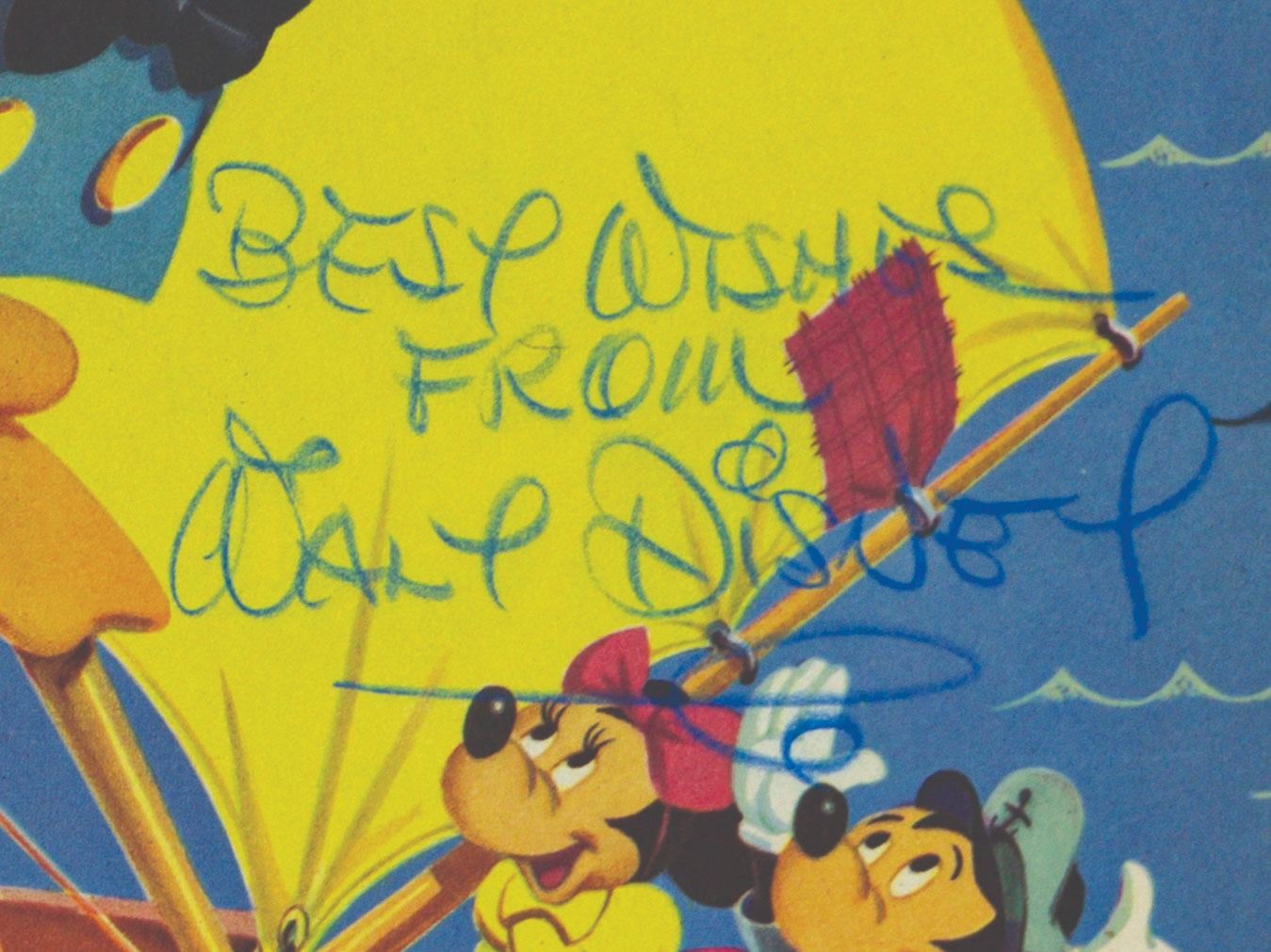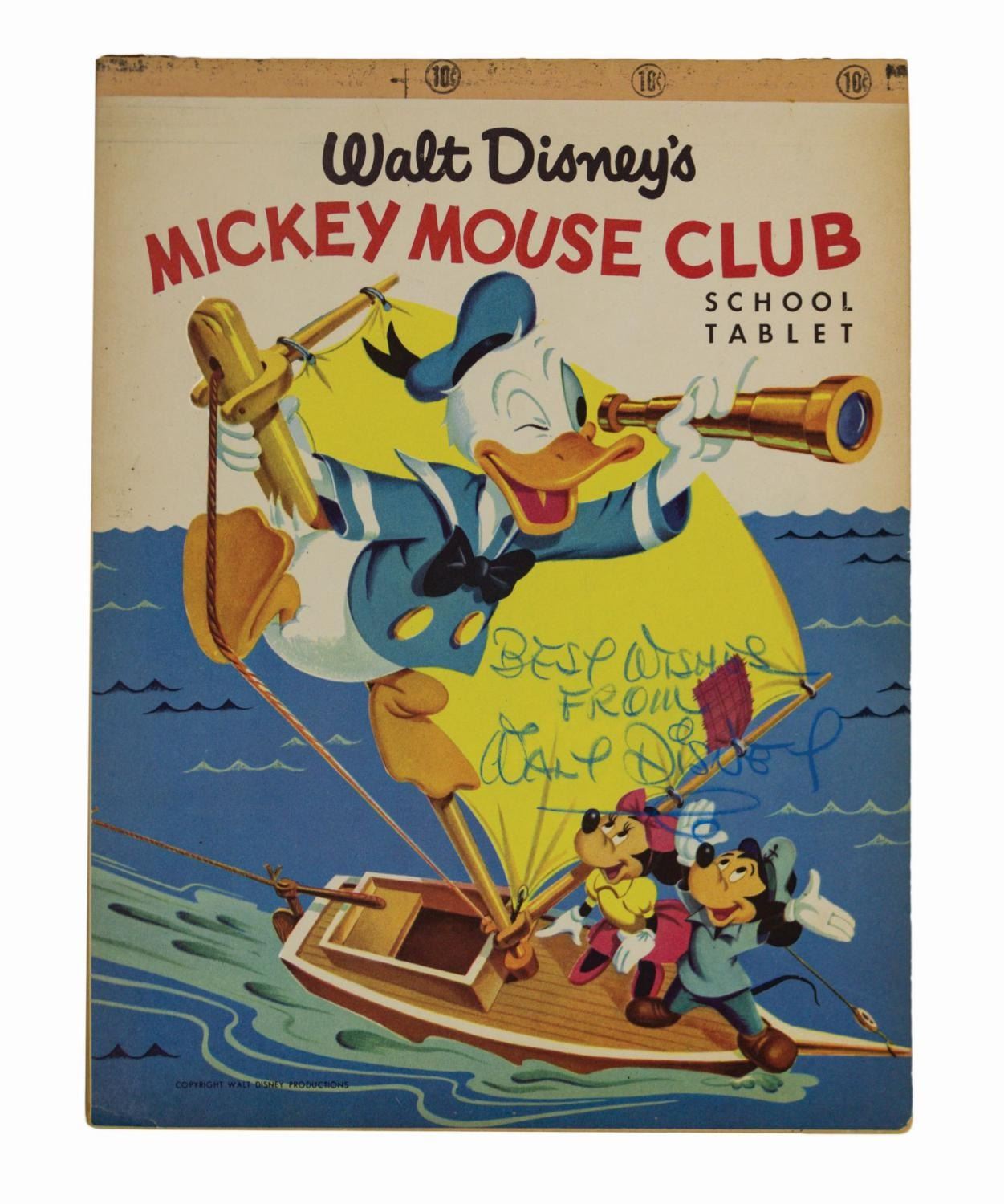 (Disney, c.1940s) A Walt Disney's Mickey Mouse Club School Tablet signed by Walt Disney. Stamped with the price of 10 cents, the unused tablet of ruled paper features a cover sheet depicting a colorful nautical scene with Donald Duck, Minnie Mouse, and Mickey Mouse. The cover is signed in blue conte crayon by Walt, "Best Wishes from Walt Disney." This interesting piece of Disneyana is made even more desirable by the most collectible autograph in American 20th century pop culture. The piece measures 10"x8" and is in very good condition. The cover sheet and interior pages exhibit some light brown toning due to age, and the upper edges show some corner wear. There is some minor scuffing and paper loss to the top edge of the binding.