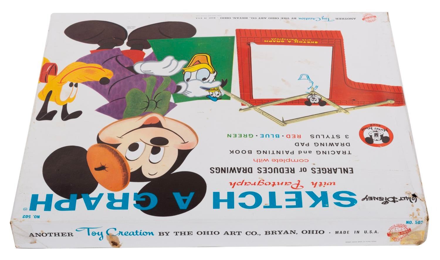 (Ohio Art, 1950s) A complete Walt Disney Sketch-A-Graph with Pantograph in the original box. The toy comes complete with all the original contents and is in very good condition with a few pages missing from the pad, and a few colored pages and creasing to the painting book. The 16.75" x 14" and 1.5" thick box is in good condition with tape repair to the corners, spots of discoloration, and a hole near the top left corner.