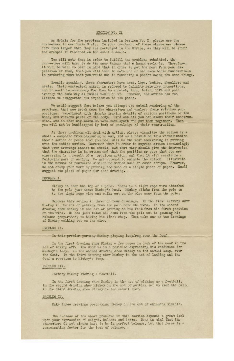 (Disney, c.1926-39) An extremely rare Walt Disney Studio application & related employment documents from the earliest days of the Studio. The documents comes with the original postmarked Walt Disney Studio envelope. The packet is addressed to Mr. E. Simon of Chicago, Illinois, who was inquiring about a position with the Studio. The envelope and ephemera bear the Hyperion Avenue address. The collection includes an unsigned letter of application, George H. Drake's studio response letter, a 3-page document expounding on animator qualifications, a "Problem" questionnaire, and an application for employment. Measuring between 8.5"x11" and 8.5"x14", the documents are in fine condition while exhibiting some toning, wear along the original folds, and minor wear to the edges and corners.