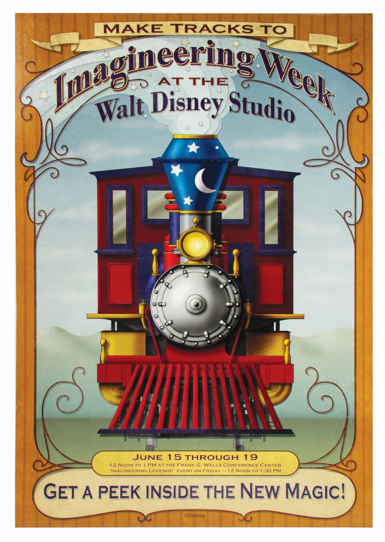 (Disneyland, 2001) A custom made event poster for "Imagineering Week" at the Walt Disney Studios. The popular event showcased planned attractions and improvements for Disneyland in the coming years, with this poster depicting the Disneyland Railroad. The poster is printed and adhered to foam board, and measures 39.5"x26.25". The condition is good with some surface wear from use.