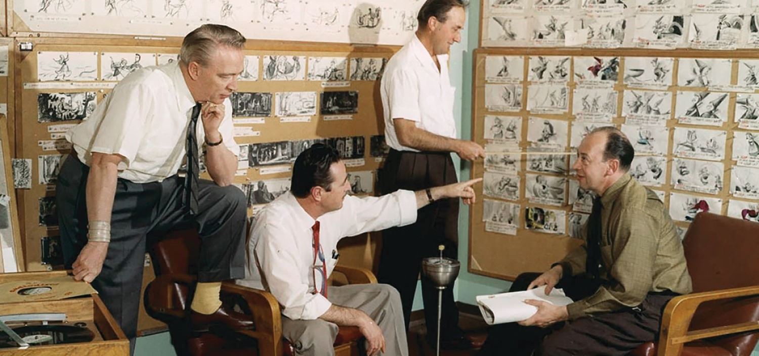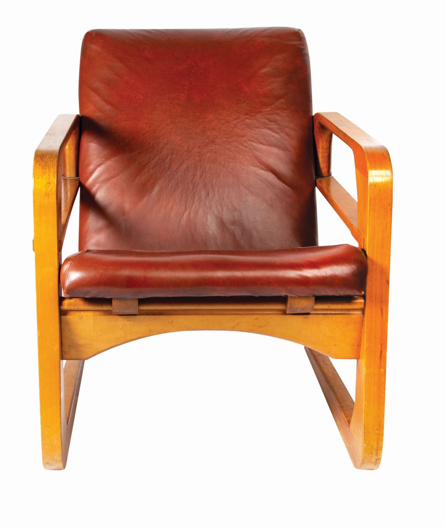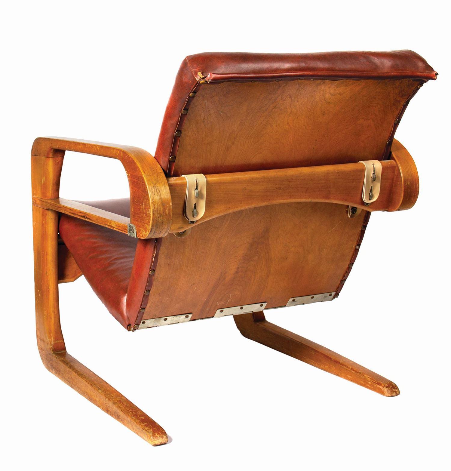 (Weber, 1938) An original Kem Weber "airline" style chair from the Walt Disney Studios in Burbank. Walt Disney trusted German artist Kem Weber to design nearly every aspect of his new Burbank studio in 1940. Weber contributed to the architecture, interior design, and even the font choices used on the buildings. Today, Weber is likely best remembered by his "airline" style chair. An icon of the mid-century modern aesthetic, Weber designed the chair with beautiful slopes and angles that were the inspiration behind its "airline" name. It is believed that only approximately 200 of these chairs were produced, with a large portion of that 200 used by Disney to furnish his new studio. From Walt Disney, to the Nine Old Men, to the future Imagineers who helped build Walt's park, one can only imagine the true Disney Legends who have used these Kem Weber chairs at the Walt Disney Studios over the years. This particular chair still retains its Walt Disney Productions studio identification tag underneath the right arm rest. The studio address of 2400 Alameda Ave. is listed on the tag with the ID number 2613. The padded seat and chair back form one separate hinged piece that rests within the wooden frame and contains straps that attach to small hooks on the back of the chair. The chair measures approximately 24.5" wide, 32" deep, and 30" tall, including the upholstered seat and chair back. The actual seating area measures approximately 21"x21". The condition is good overall, with expected wear throughout from studio use including some scuffs and dings to the wooden frame, and some wear to the upholstery such as a small indentation on the seat. Special shipping arrangements may apply, please inquire for details and estimates.