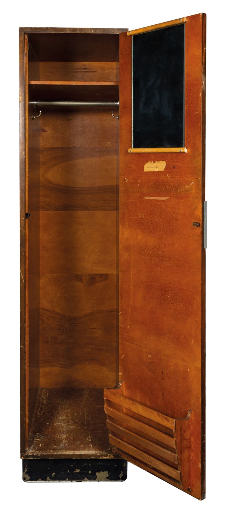 (Disney, c.1940) A very rare original office wardrobe closet from the Walt Disney Studios. The closet was designed by renowned German designer Kem Weber for the new Burbank studio in 1940. Weber designed virtually every aspect of the new studio, including the sleek office furniture. This stylized wardrobe was a common sight in the offices of the studio's legendary animators, and includes the original hanging bar and two hooks, as well as a wooden storage space at the foot of the door. The mirror and its molding have been reproduced in the style of the original. The wardrobe retains its original Walt Disney Productions identification label with the number 1617 that was blacked out after its initial use. The closet measures 66" tall, 16" wide, and 22" deep. The condition is fair, with some moderate scuffs and scratches throughout from use. There are some chips and removed portions in the wooden paneling, particularly along the top where tape has been used to mitigate lifting of the paneling, and some interior surface wear from its original use at the Walt Disney Studios. This item may require special shipping arrangements, please inquire for details and estimates.