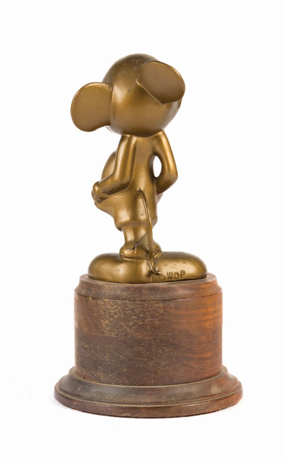 (Walt Disney Studios, c.1950s-60s) Arguably the most coveted award that Disney could bestow, the Mousecar is a prestigious in-house award given to those who have performed exceptional service to Walt Disney Productions. Beginning in 1947, Walt Disney gave the first Mousecar to his brother Roy Disney, and since then, recipients have included Louis Armstrong, Bernie Cobb, Marc Davis, The Sherman Brothers, and more. This Mousecar was awarded to Director and Film Maker Robert (Bob) Stevenson, and reads, "With thanks and appreciation for your many contributions - Mickey". The bronze-colored Mickey Mouse is accomplished in metal over a wooden base, and measures 5" in diameter and 9" high. This award is in very good condition and has been repaired at the legs.