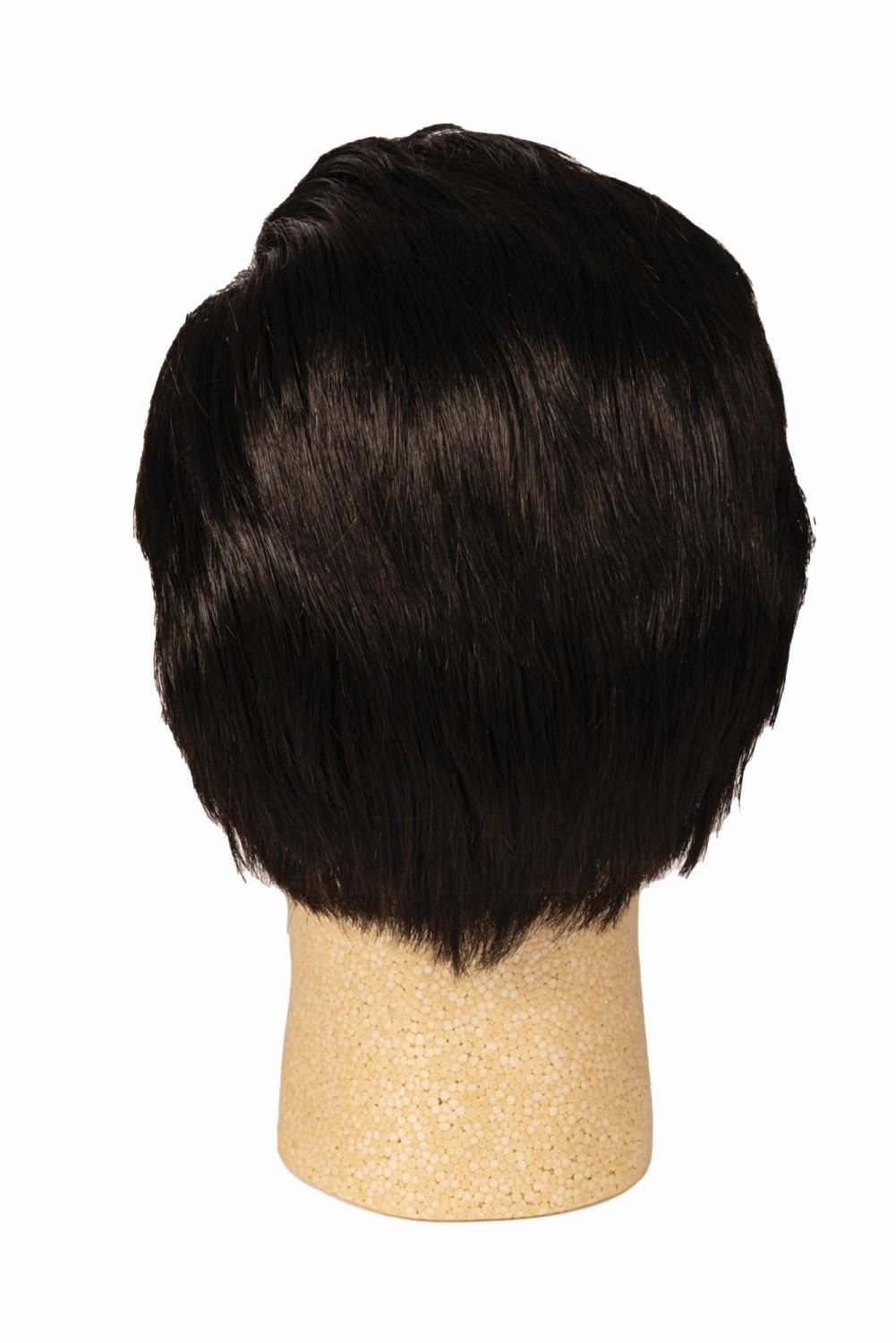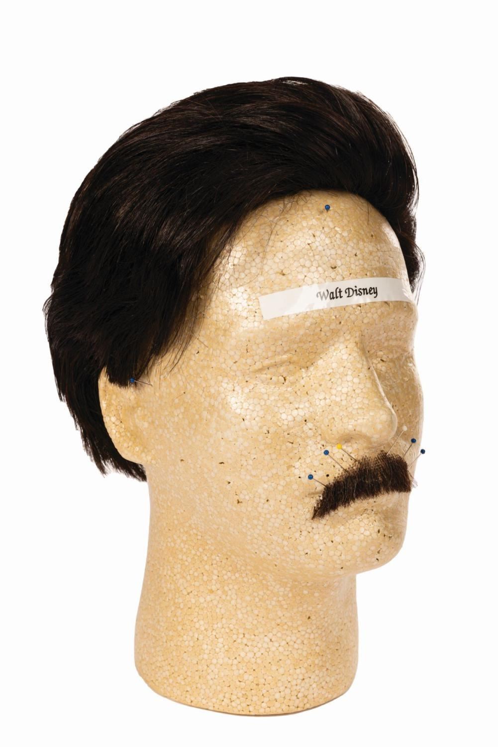 (Disneyland, 2000s) A lace human hair wig and mustache recreating the iconic dark brown quaff of a young Walt Disney. The Amore for Rene of Paris hand-punched wig is styled in Disney's signature sweeping part and the mustache is finely manicured. This set was assembled for use by the Disneyland Entertainment Department for a special event. The wig and mustache are assembled on a foam mannequin head, and the display measures 12.5"x7.5" and 8.5" deep. The toupee and 2.5" long mustache remains in very good condition with only minor wear.