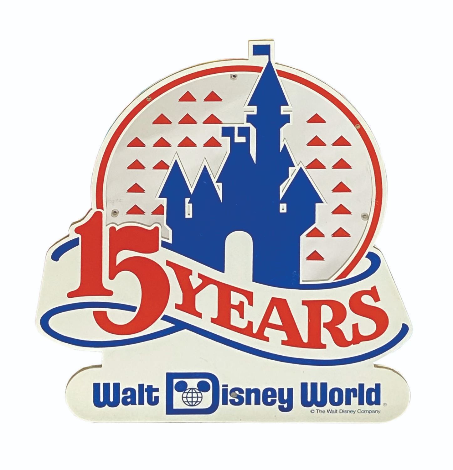 (Walt Disney World, 1986) A lamppost sign created in celebration of Walt Disney World's 15th anniversary. Constructed of mirror-backed acrylic, the die-cut sign features screen printed design elements and the lettering, "15 Years." Measuring 21"x18.5", the sign is in very good condition with some scuffing and minor scratching to the surface throughout from use. There is some glue residue visible around the edges where the sign has been attached to a second die-cut acrylic board for stability.
