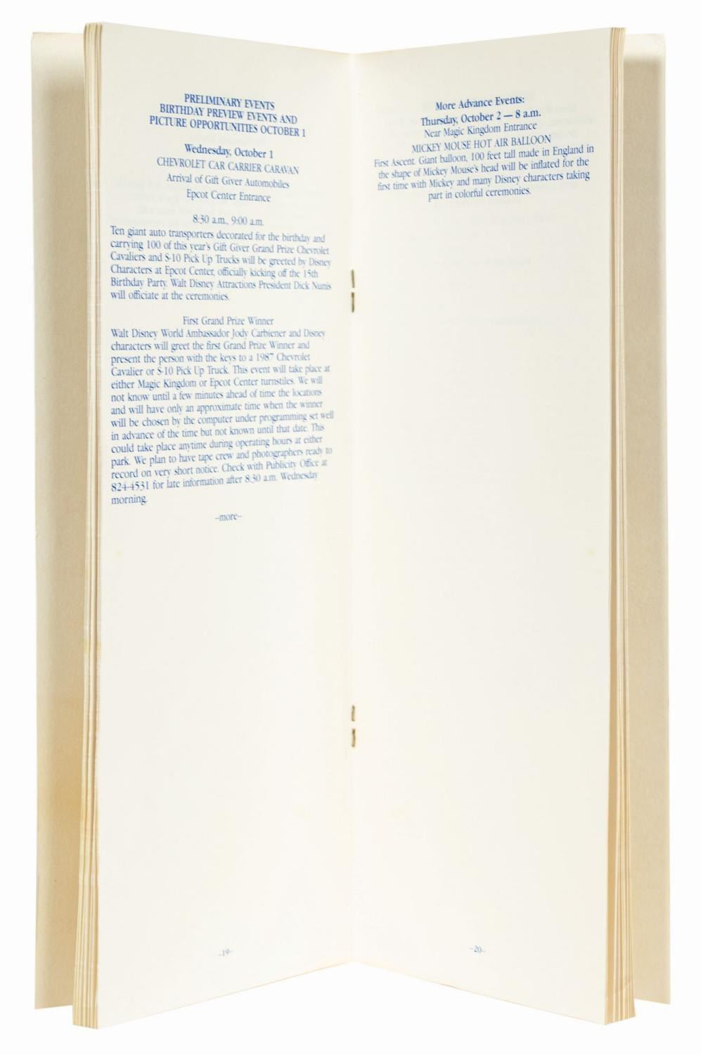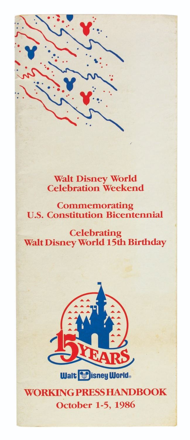 (Walt Disney World, 1986) A vintage Working Press Handbook for the Walt Disney World Celebration Weekend festivities commemorating the U.S. Constitution Bicentennial and Walt Disney World's 15th birthday, held October 1-5, 1986. The 39-page booklet provides a daily itinerary of exciting events, as well as travel details, a list of Disney executives and creative personnel available for interview, story ideas, extensive public relations contact lists, and more. Measuring 11"x4.25", the handbook is in very good condition with some minor faint soiling to the covers.
