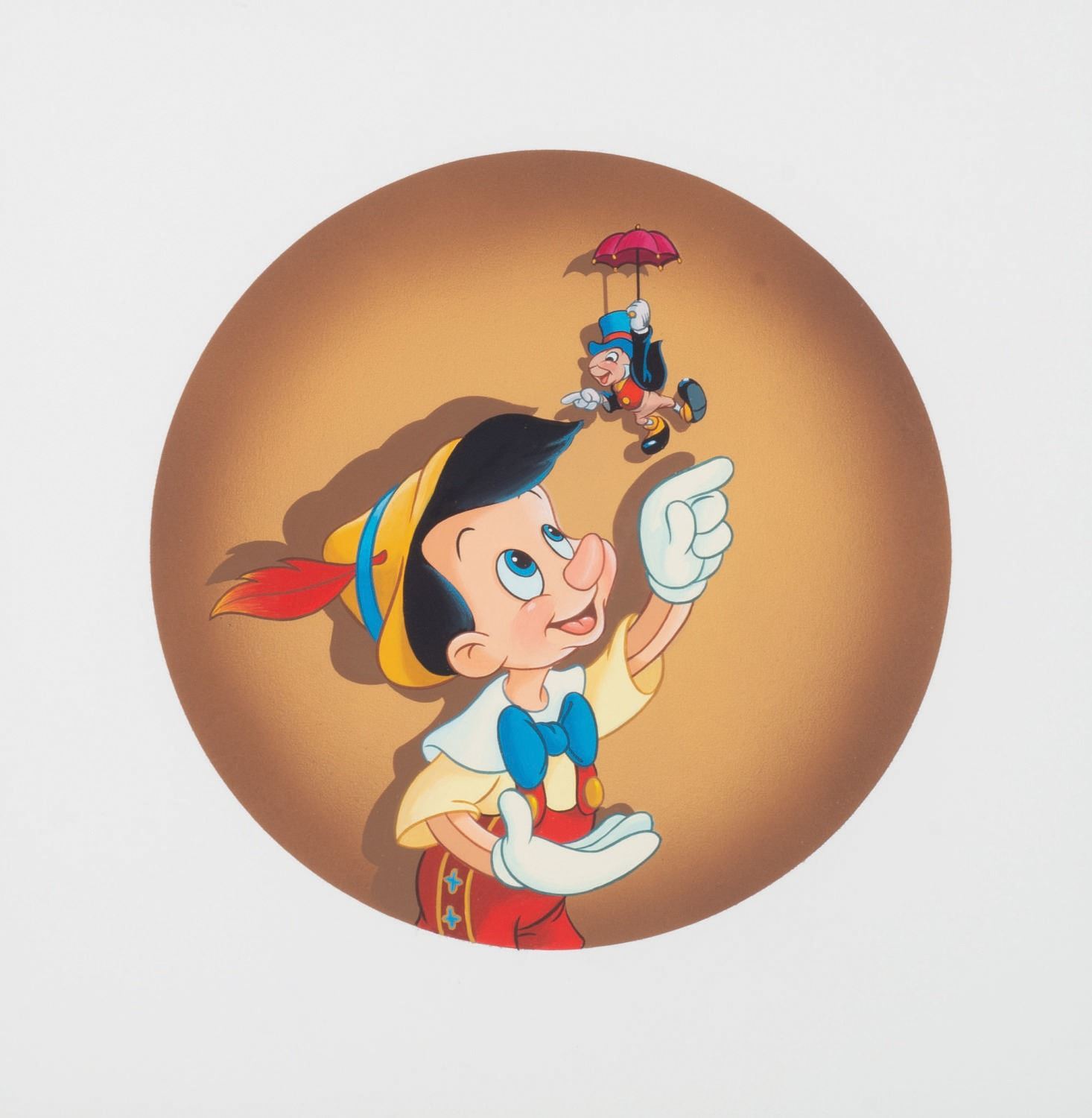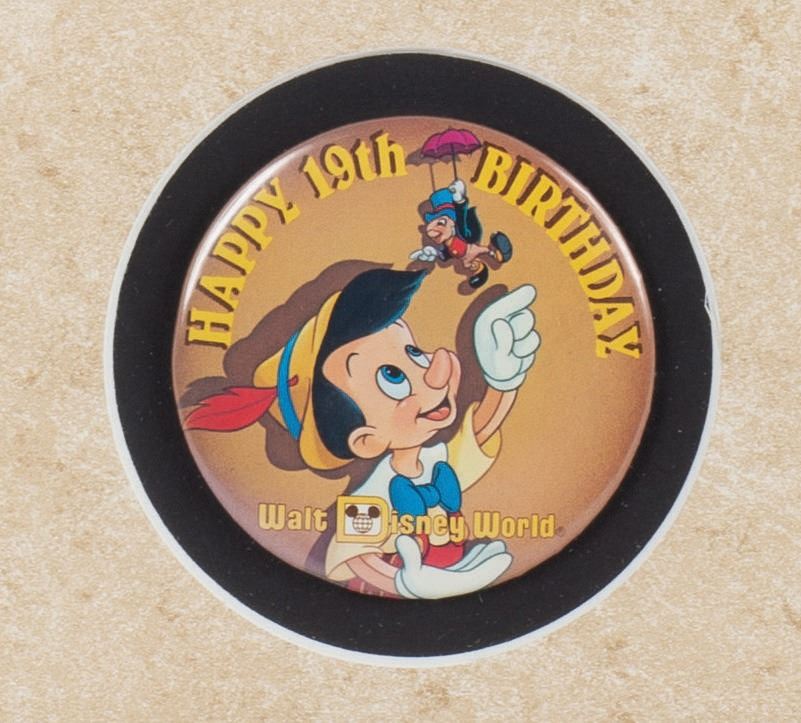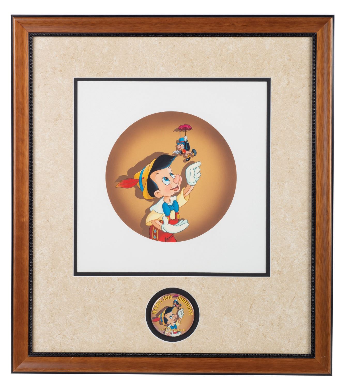 (Walt Disney World, 1990) Extremely rare original artwork by Don "Ducky" Williams used for a button celebrating the 19th anniversary of Walt Disney World. Walt Disney World's 19th birthday fell in 1990, which was also the 50th anniversary of Pinocchio. Framed with the 3" button it was created for. The original art measures 9" in diameter, on 13"x13" visible artboard, double matted in an approximately 22"x24.5" frame. The artwork is in very fine condition, with slight scuffs to the fine frame.
