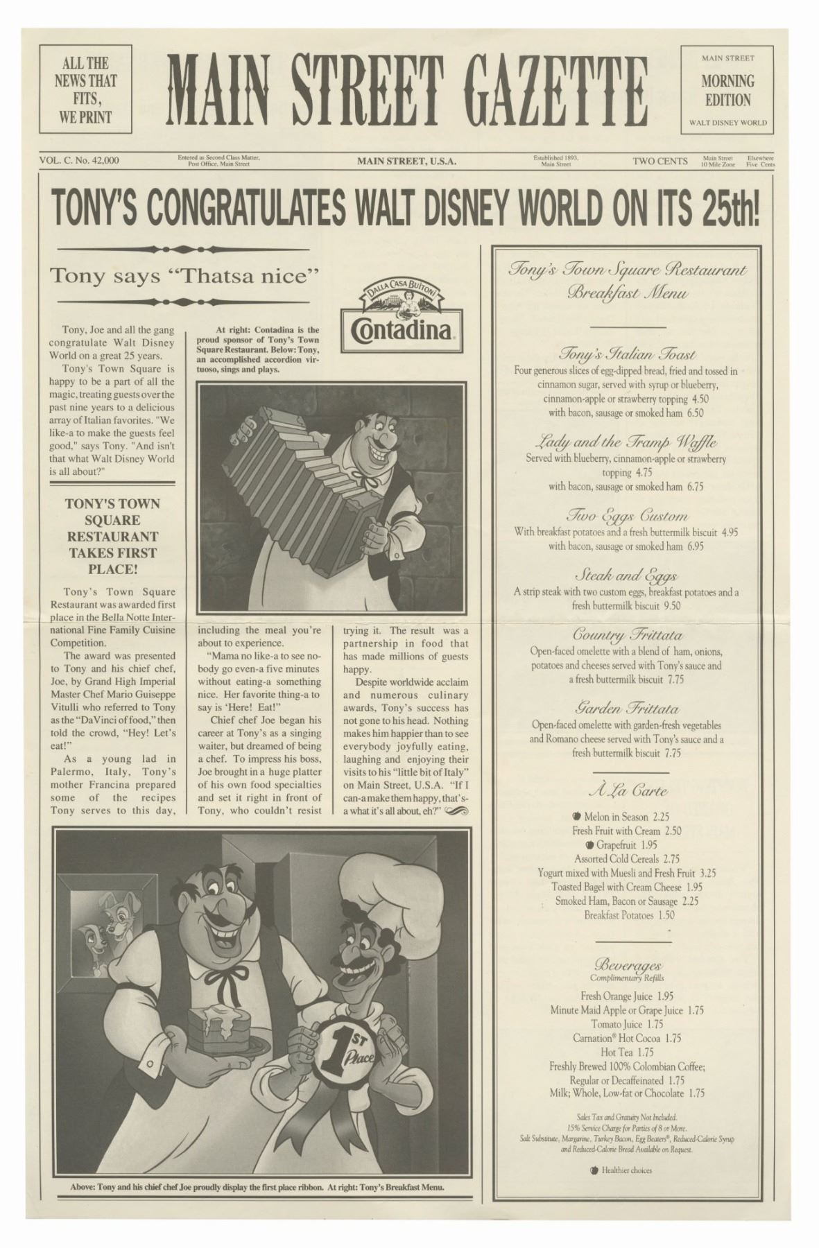 (Walt Disney World, 1996) A very rare edition of the Main Street Gazette from the 25th anniversary of Walt Disney World. This double-sided news edition includes a breakfast menu from Tony's Town Square restaurant on the front, with various articles on the reverse. Measuring 17"x11" unfolded, the news edition is in very good condition with minor wear.
