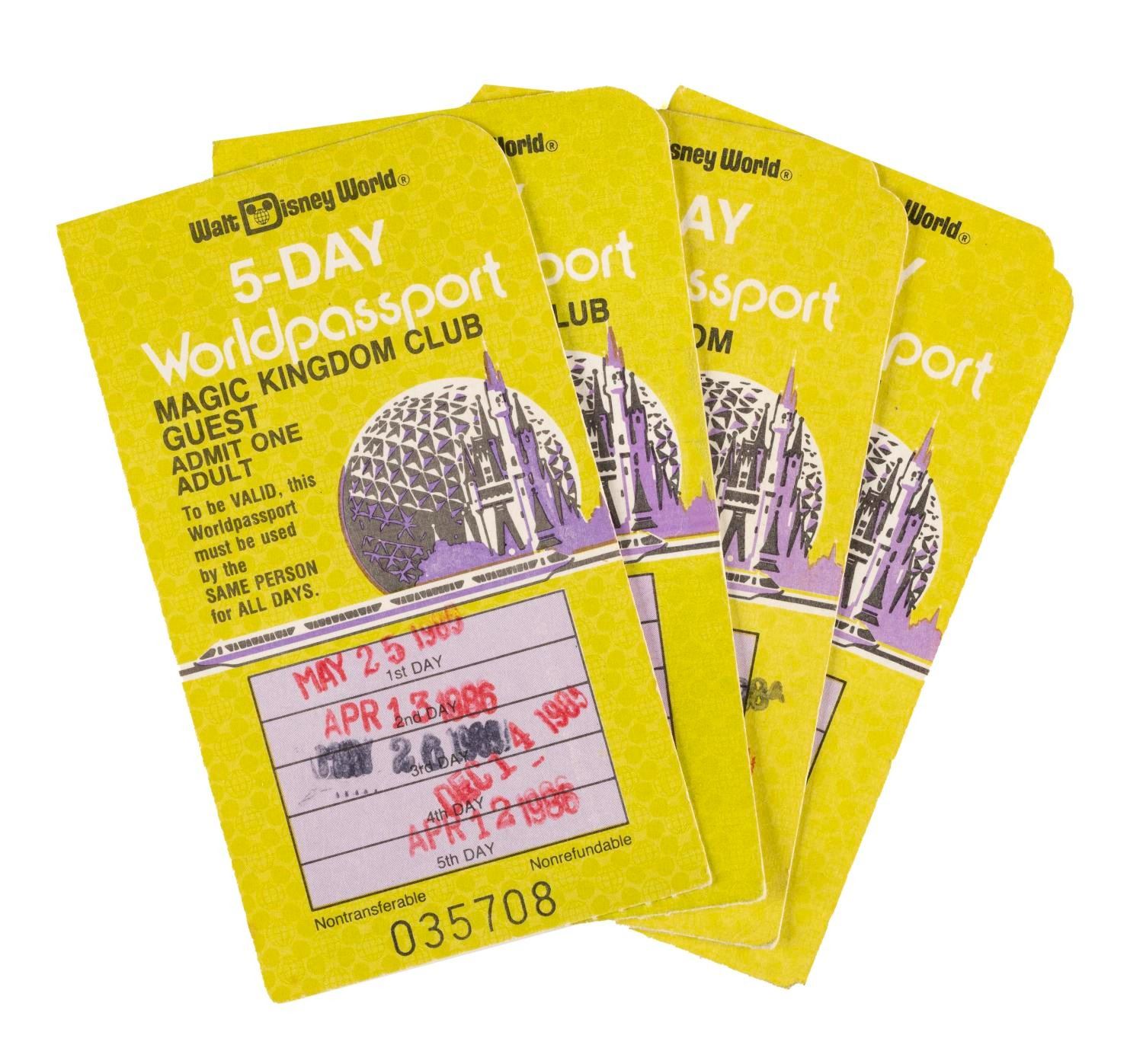 (Walt Disney World, 1984-86) Four Magic Kingdom Club Walt Disney World 5-Day Guest Worldpassports. The tickets are numbered 007084, 007083, 001627, and 035708 and are stamped for various dates from 1984 to 1986. Measuring 2.5" x 4.25", each passport is in good used condition with faint creases and minor wear.
