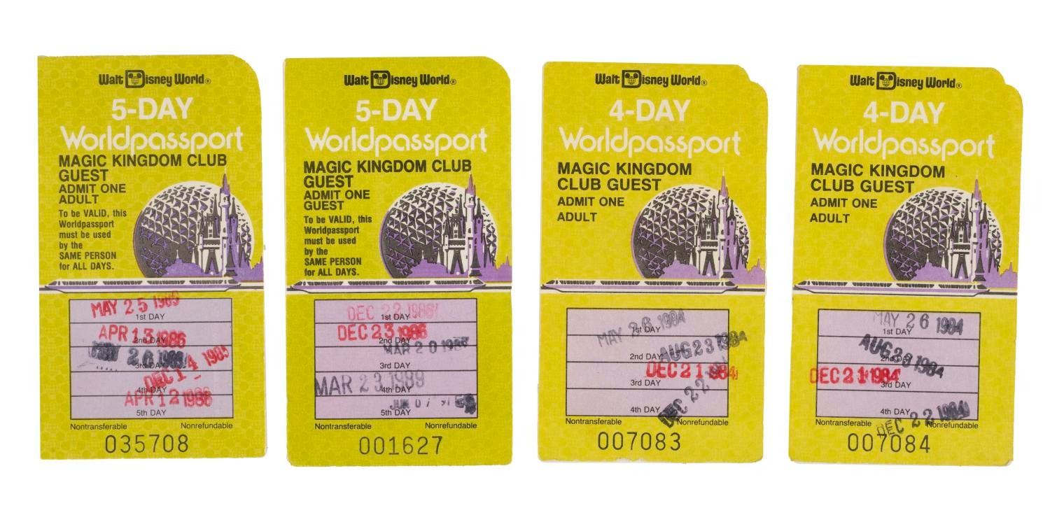 (Walt Disney World, 1984-86) Four Magic Kingdom Club Walt Disney World 5-Day Guest Worldpassports. The tickets are numbered 007084, 007083, 001627, and 035708 and are stamped for various dates from 1984 to 1986. Measuring 2.5" x 4.25", each passport is in good used condition with faint creases and minor wear.