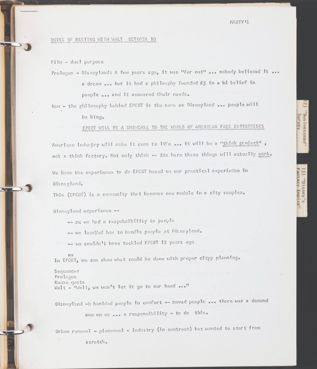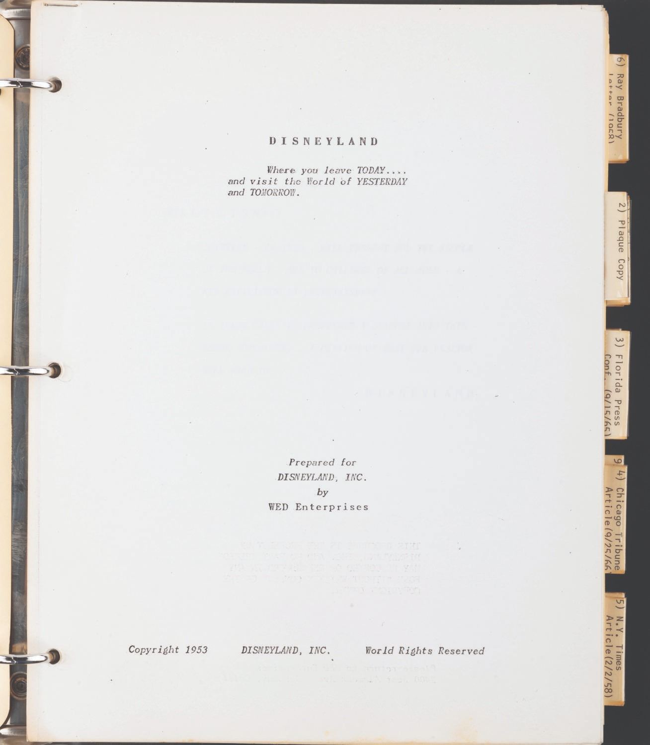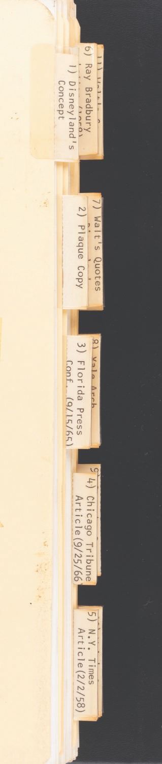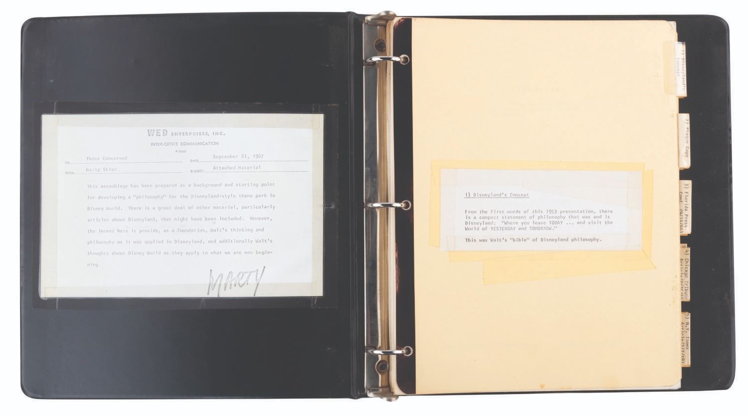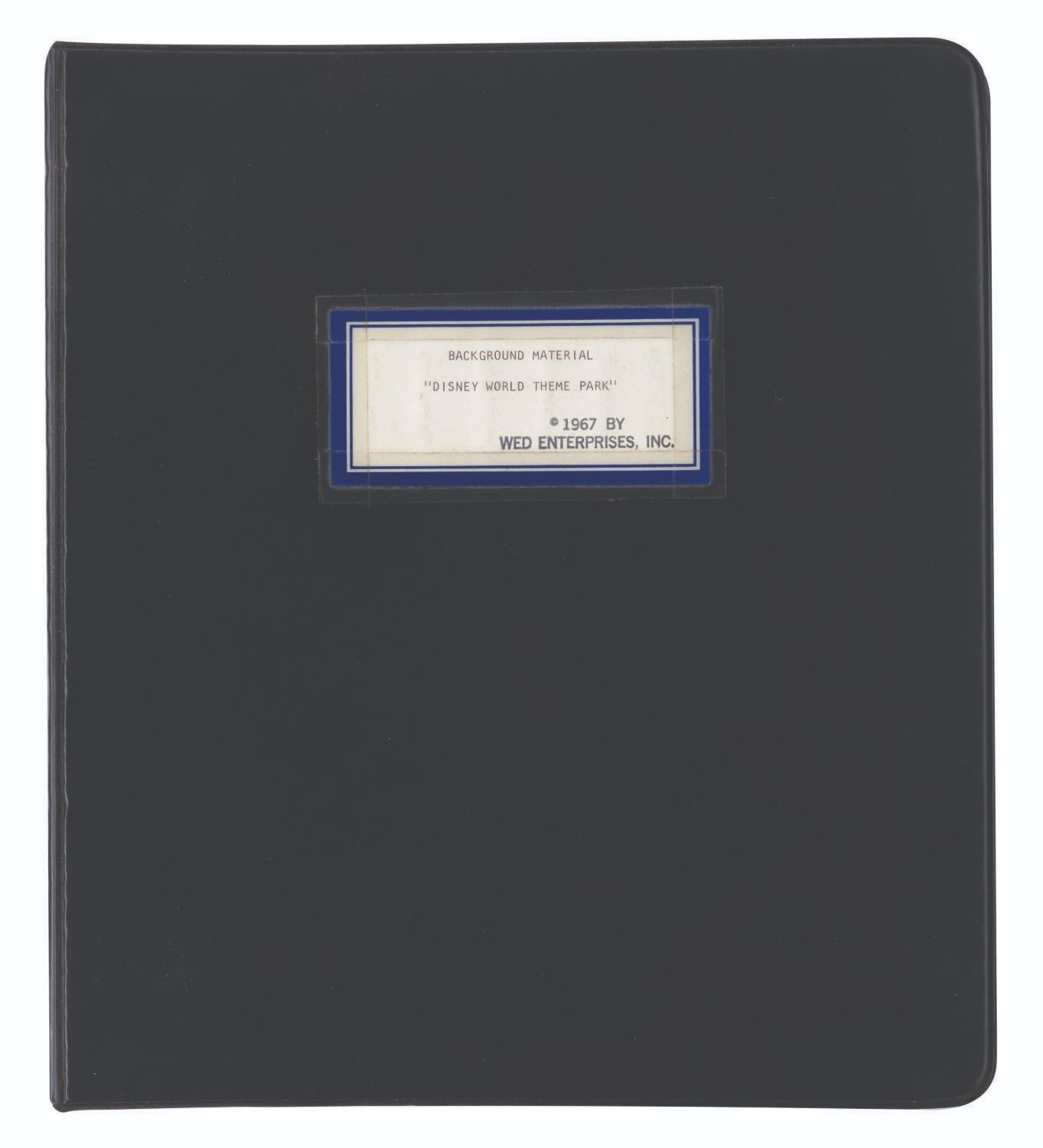 (WED, 1967) A compilation of documents and articles assembled by Disney Legend Marty Sklar as a starting point for Imagineers to develop the "Disneyland-style theme park in Disney World." The binder contains a copy of Walt's 1953 descriptions of Disneyland, articles on Disneyland, interviews with Walt, and other text materials to illuminate Walt's thinking and philosophy for the Walt Disney World project. The binder provides incredible insight into how the company attempted to keep Walt's vision alive as they moved forward after his death. The 91-page binder measures 10.25” x 11.5” x .5” thick and is in good condition with general wear from use.