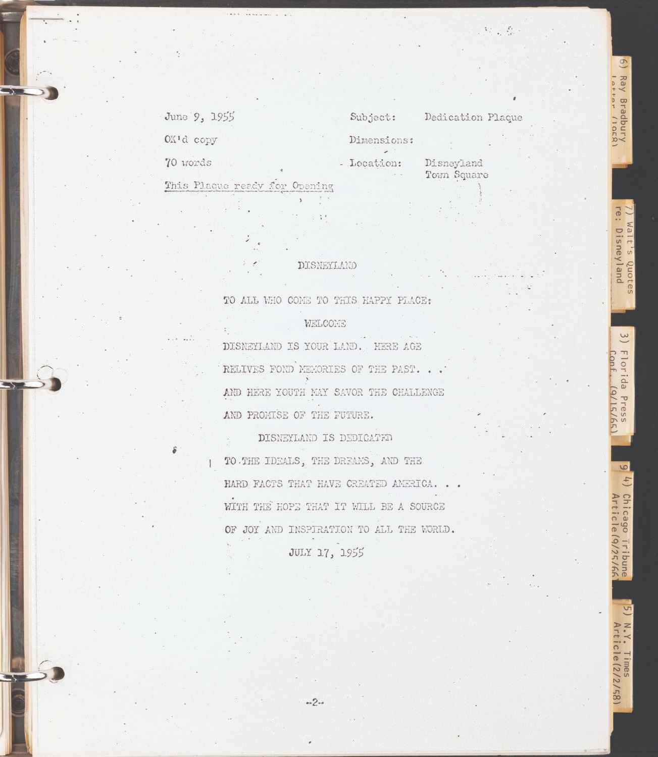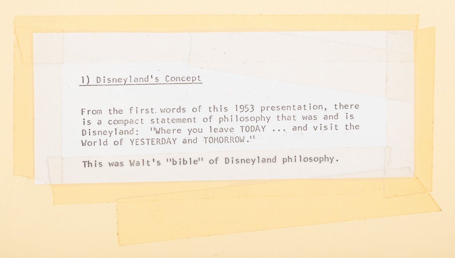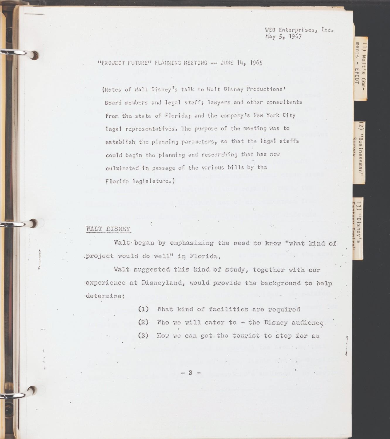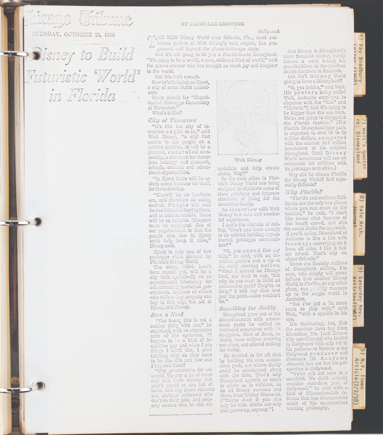 (WED, 1967) A compilation of documents and articles assembled by Disney Legend Marty Sklar as a starting point for Imagineers to develop the "Disneyland-style theme park in Disney World." The binder contains a copy of Walt's 1953 descriptions of Disneyland, articles on Disneyland, interviews with Walt, and other text materials to illuminate Walt's thinking and philosophy for the Walt Disney World project. The binder provides incredible insight into how the company attempted to keep Walt's vision alive as they moved forward after his death. The 91-page binder measures 10.25” x 11.5” x .5” thick and is in good condition with general wear from use.