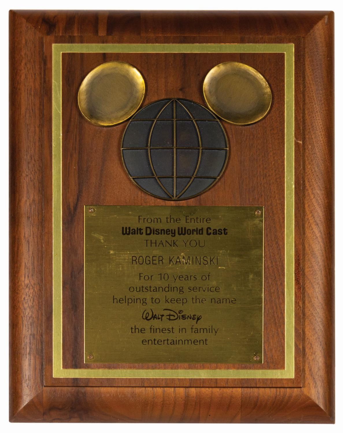 (Walt Disney World, 1980s) A rare original Walt Disney World Cast Member 10th Anniversary plaque. The wooden plaque features a metal relief Mickey Mouse globe logo and a dedication plate thanking the cast member for a decade of outstanding service to the Walt Disney company. Measuring 12"x9" and 1" deep, the plaque is in very good condition with a few minor nicks to the wood, and spot oxidation and surface wear to the plate.