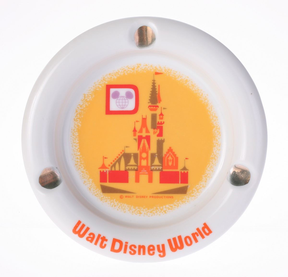 (Walt Disney World, 1970s) Ceramic ashtray with Cinderella Castle imagery in the center in beautiful red and orange tones. Measures 5" in diameter and 0.75" tall. In good condition.