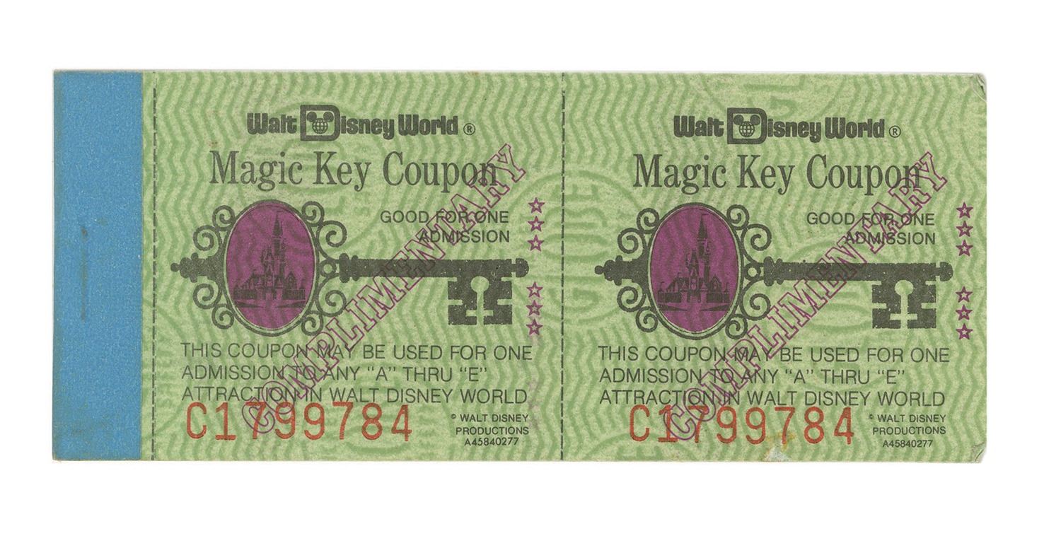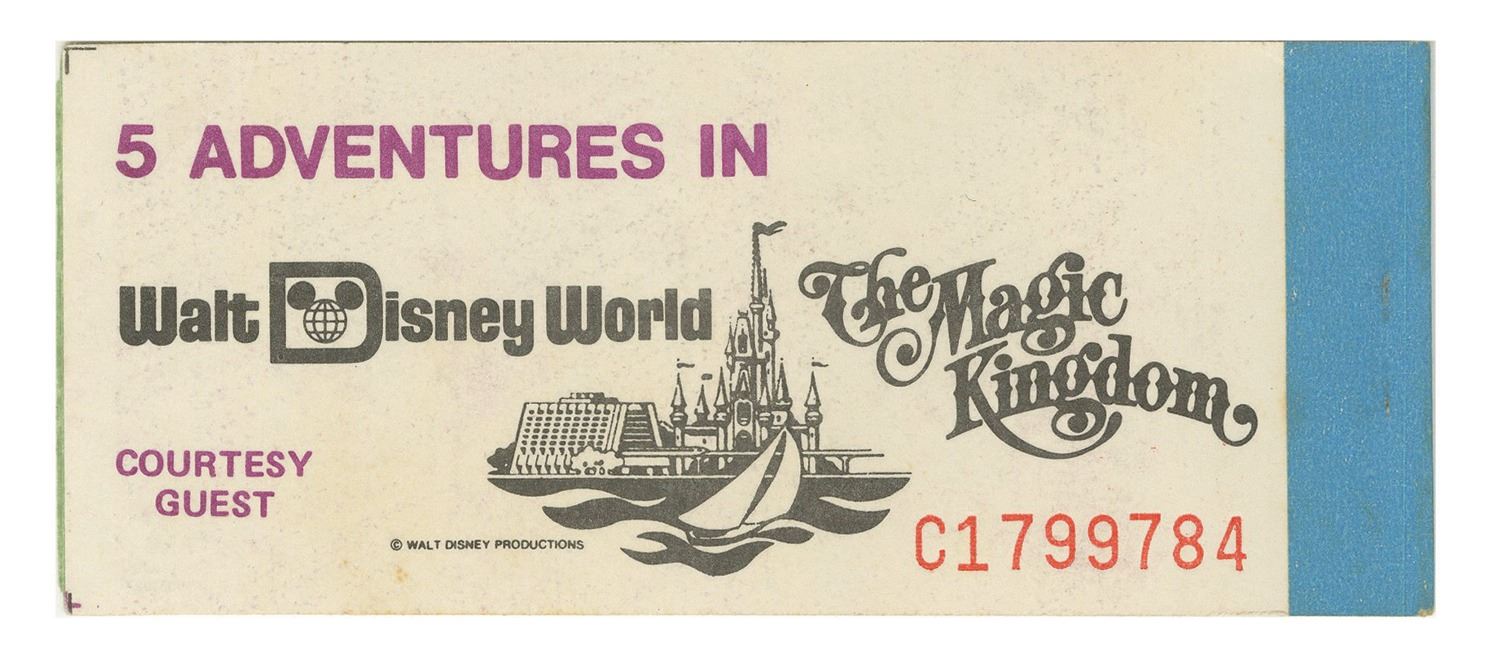 (Walt Disney World, 1979) A rare Walt Disney World ticket book with (6) admission tickets still attached, good for any "A" through "E" attraction. The ticket book is number C1799784, and retains its cardstock backing with an image of Cinderella Castle and the Contemporary Resort. Measuring approximately 2"x4.75", the ticket book is in good condition with edge wear and wrinkled corners.