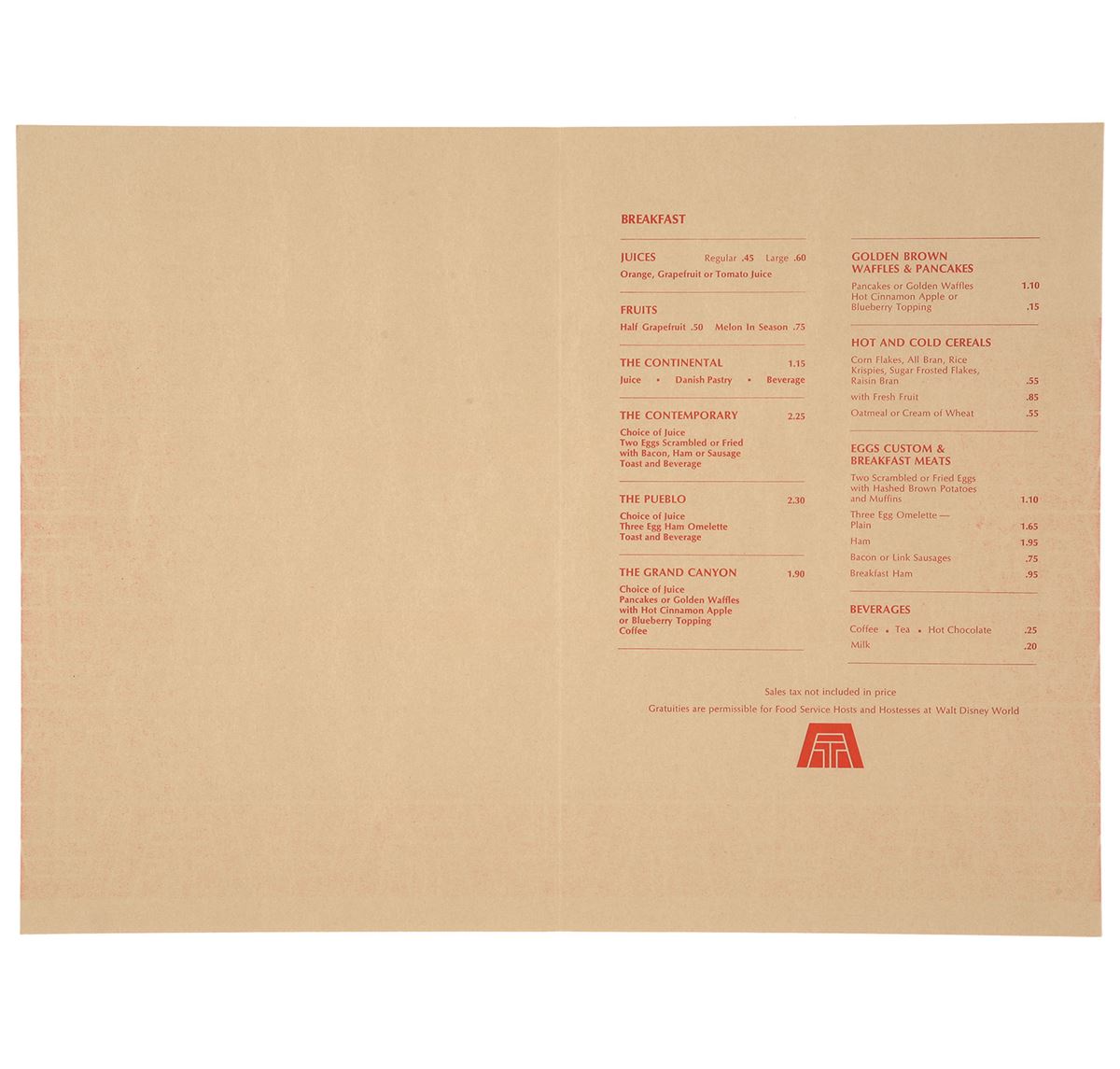 (Walt Disney World, 1971)Rare first year Breakfast menu for the Grand Canyon Coffee Shop in the Contemporary Resort at Walt Disney World. The simple fold out menu features resort themed graphics and measures 8 x 12 in. folded. In very good condition with very little wear.