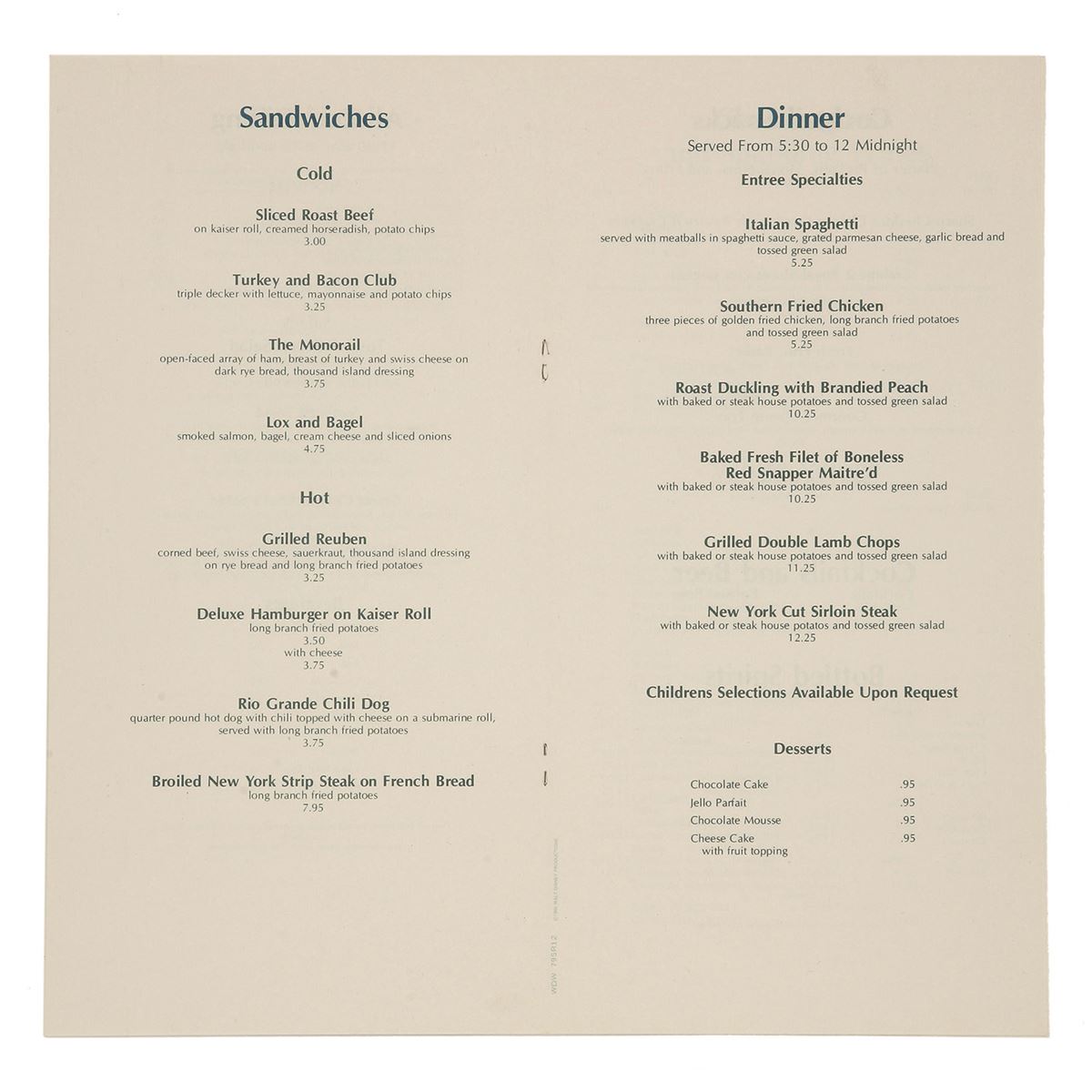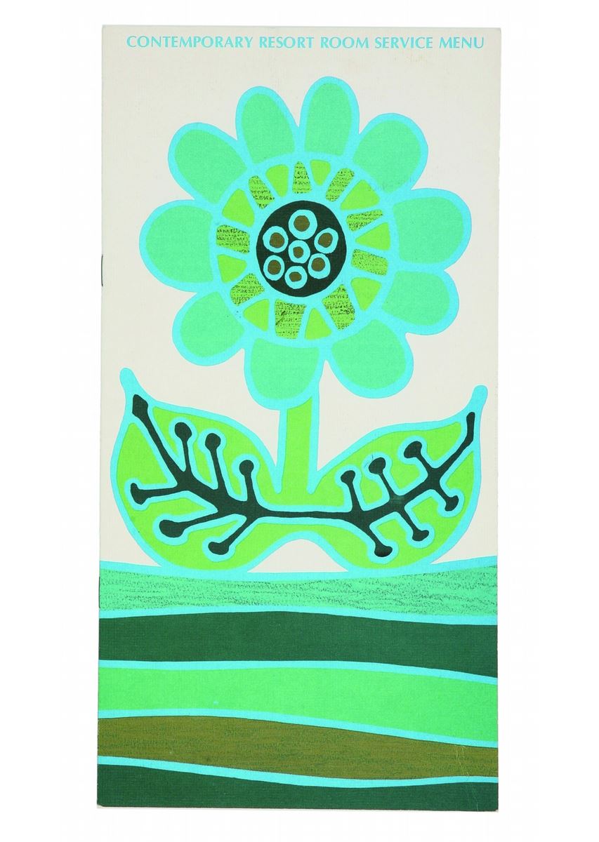 (Walt Disney World, 1980) Opening in 1971, the Contemporary Resort was the flagship of the Walt Disney World Resort for more than 15 years. This circa 1980 room service menu features the graphics and color schemes featured throughout the resort during this era. The menu has 5 double sided printed pages and measures 6 x 12 in. In very good condition with light wear.