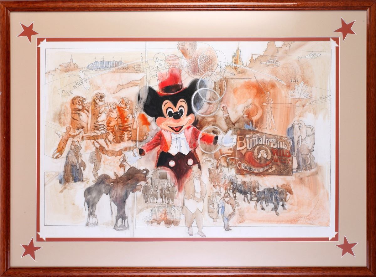 (Walt Disney World, 1987) Original watercolor painting by Disney artist Ed French, for the "Walt Disney World EPCOT Daredevil Circus Spectacular" in 1987. With a “center ring” 400 feet in diameter and Spaceship Earth as its backdrop, the Daredevil Circus Spectacular brought an “international cast of spine-tingling acts” to Epcot for a 30-minute show. Walt Disney World Artist Ed French was tasked with capturing the excitement of the spectacular in a painting to be used for promotional purposes. This painting was the result. Accomplished in graphite and watercolor on 20"x30" paper, the artwork is beautifully mounted and framed. Overall framed size is 27"x36". In very good condition with some wear and scratches to frame.