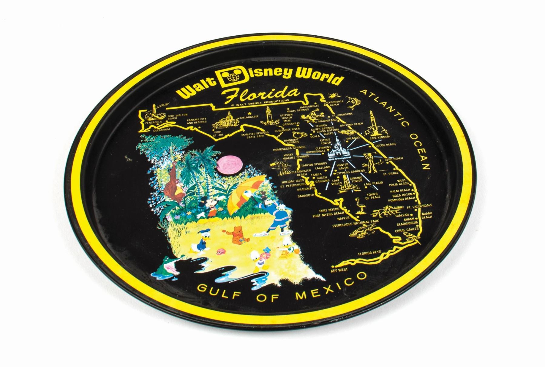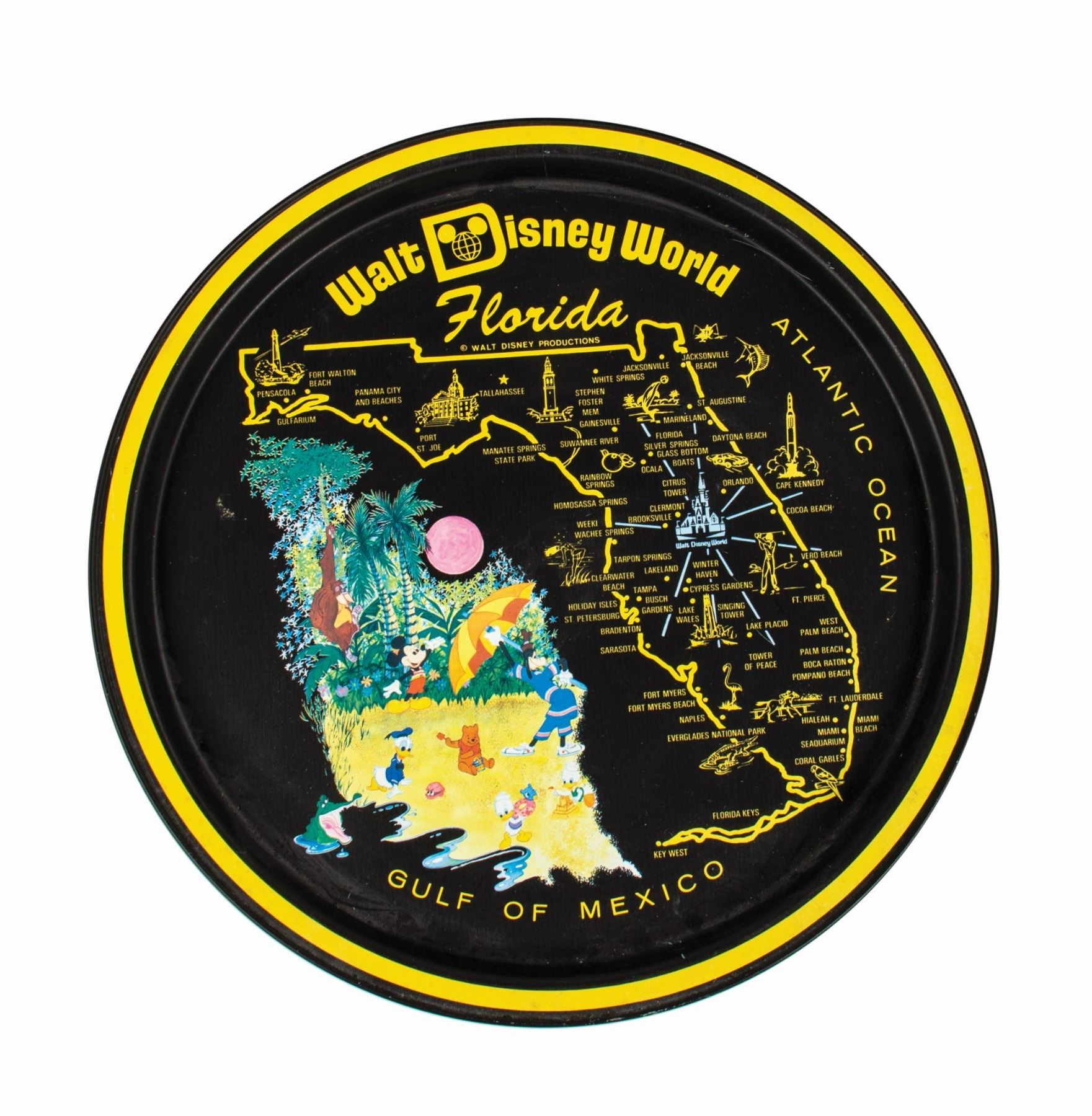 (Walt Disney World, c.1970s) A stylish tin serving tray featuring Walt Disney World's location within Florida. A variety of tourist destinations throughout Florida are also marked, and this tray was created as the matching counterpart to the similar Disneyland California trays. This tray measures approximately 11" in diameter. The condition is good overall with some surface scuffs from use, particularly to the rim on the base.