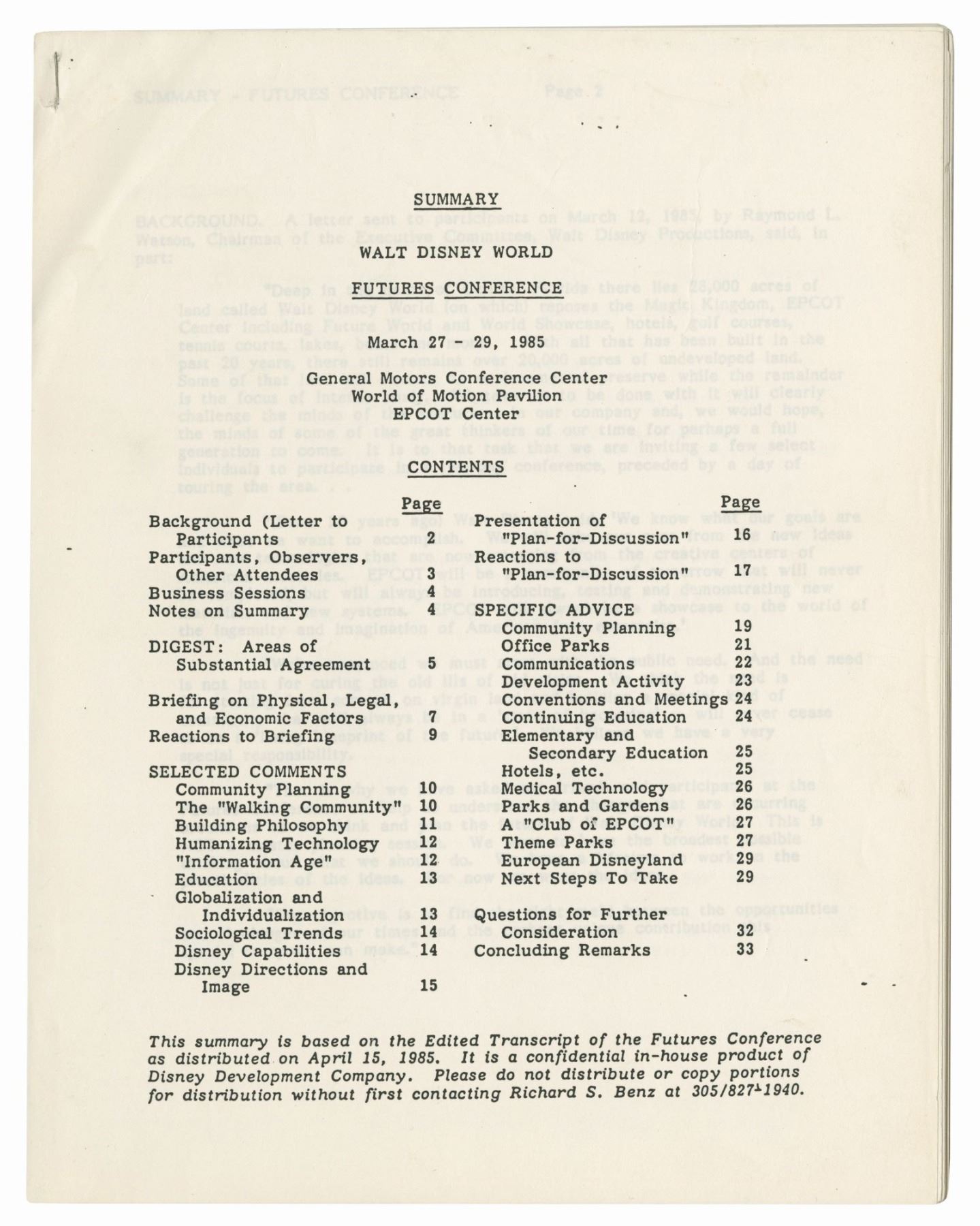 (Epcot, 1985) A very rare internal document prepared as a summary of the Futures Conference held at the World of Motion Pavilion at Epcot Center on March 27-29, 1985. This 33-page packet summarizes this important series of meetings, in which the future of Walt Disney World was discussed by select higher-ups at Disney as well as invited guests, including: Roy E. Disney, Michael Eisner, Dick Nunis, Marty Sklar, Frank Wells, Patty Disney, and many others. Following the death of Walt Disney, Epcot changed significantly from a planned community to more of a showcase of businesses and ideas. During this conference, the future of Epcot is addressed, along with the positives and negatives of attempting to adapt Epcot to become more like Walt's original vision. This fascinating document provides a wealth of scarcely seen information, and measures 11"x8.5". The condition is very good with minor wear from use.