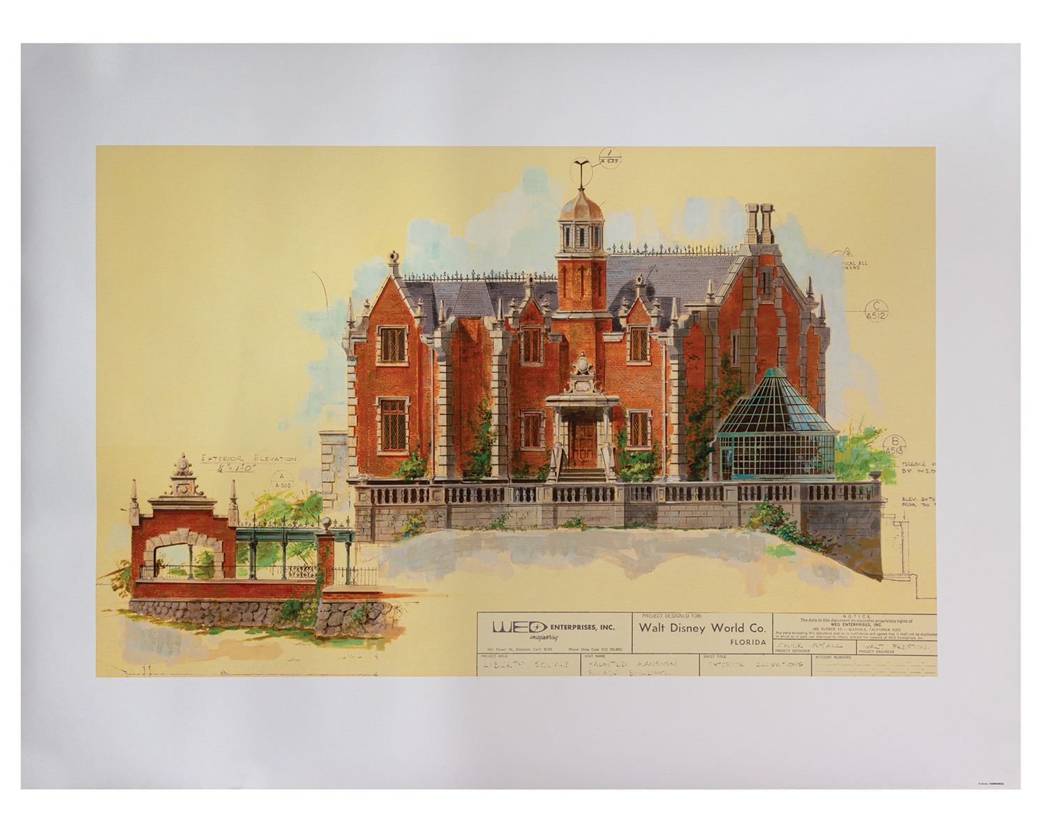 (Walt Disney World, c.2000s) A gorgeous print of the exterior elevations of Walt Disney World's Haunted Mansion attraction created using the Disney Gallery's Print on Demand service. Originally colored by Claude Coats, the print depicts a Haunted Mansion very similar to the one which stands in the park today. Measuring 36"x48", the print is in good to very good condition, with moderate edge-wear from storage, particularly along the bottom edge.